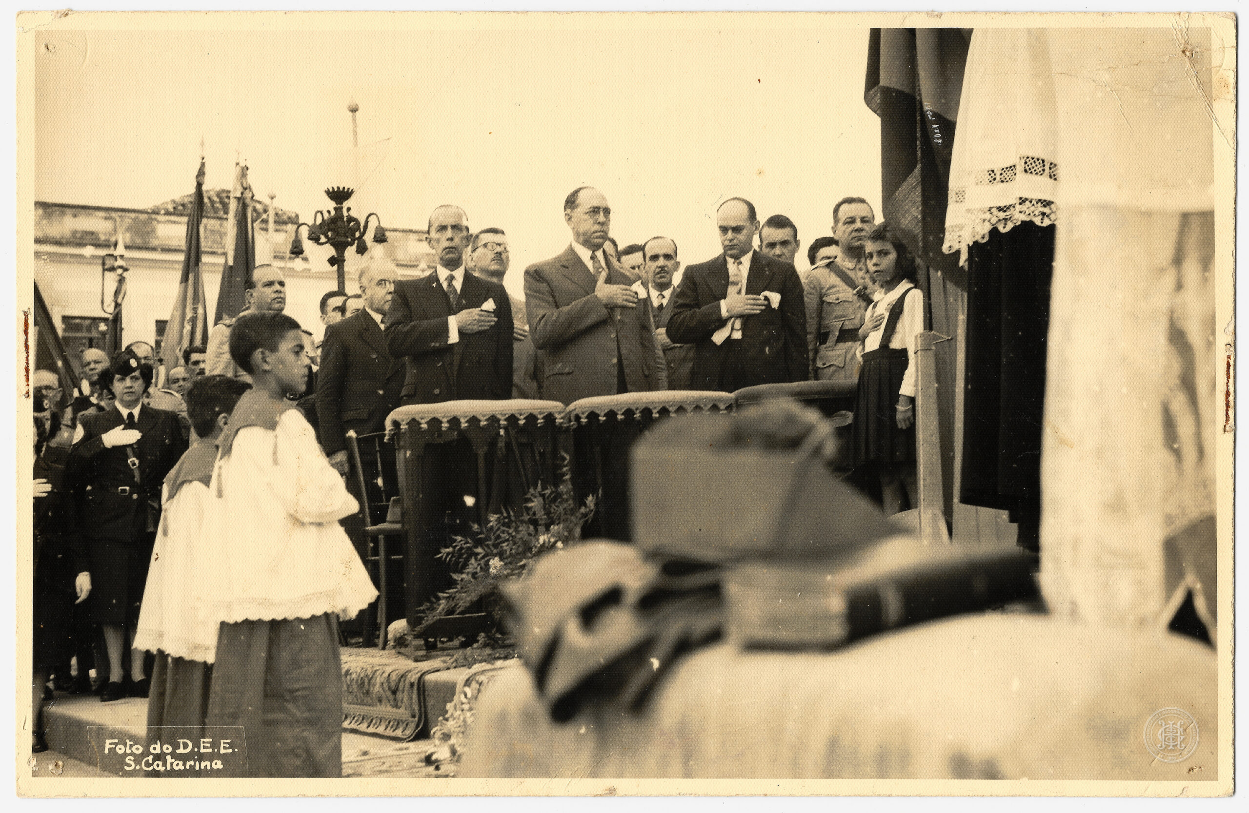 A cena, capturada em plano médio a partir de um ângulo ligeiramente baixo, foca nas autoridades posicionadas atrás de um parapeito estofado e decorado com folhagens. No centro, o Interventor Federal Nereu Ramos mantém a mão direita sobre o peito em sinal de respeito, ladeado pelo Desembargador João da Silva Medeiros Filho à sua esquerda e pelo Secretário Ivo d’Aquino à sua direita. No plano médio, à direita das autoridades, uma menina com uniforme escolar também realiza o gesto solene, enquanto ao fundo observa-se a presença de militares e da primeira-dama, Beatriz Pederneiras Ramos.