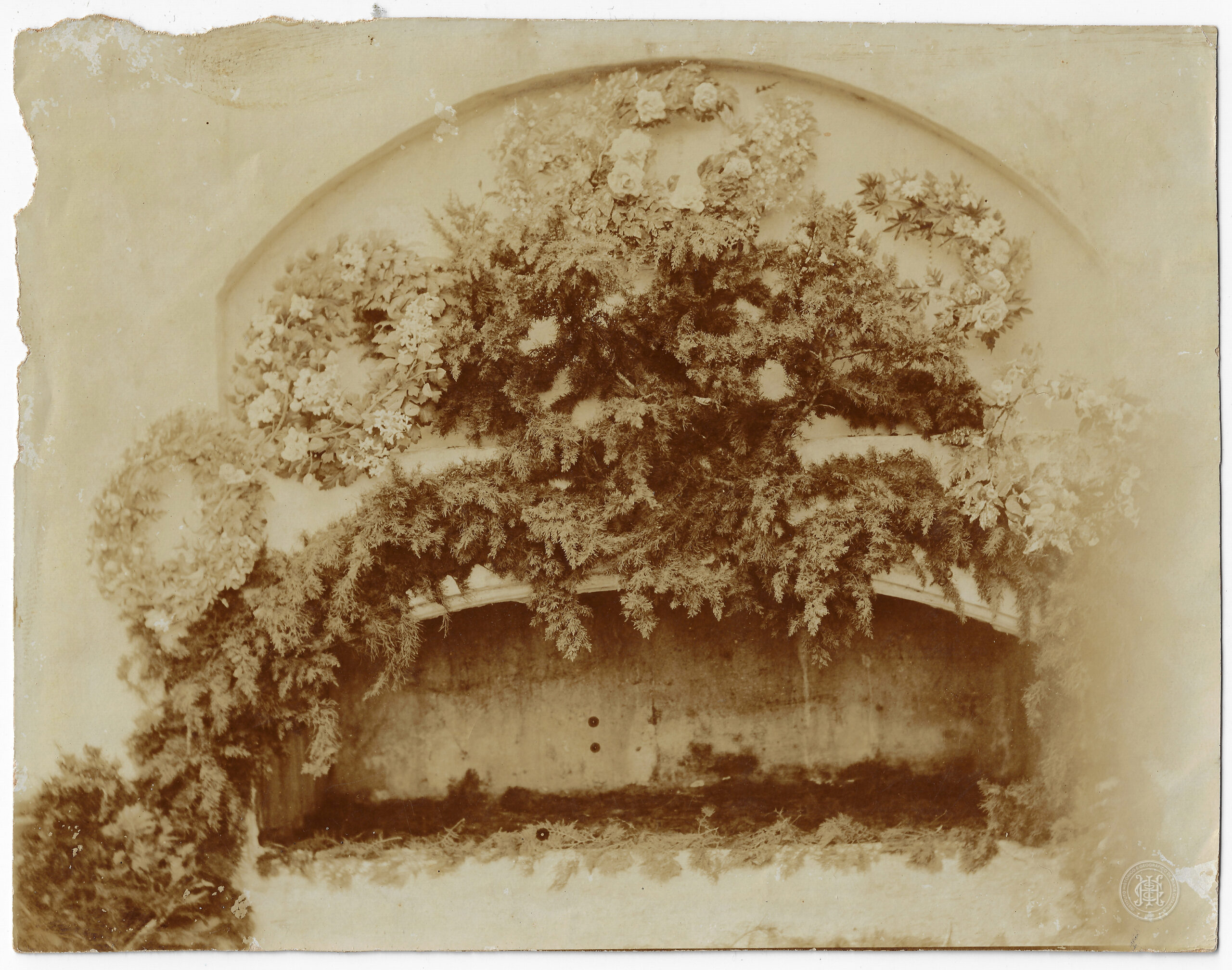 Catacumba, Cemitério, Ordem Terceira de São Francisco da Penitência, Rio de Janeiro, Jazigo, Nicho funerário, Rituais de morte, Homenagem póstuma, General M. Magalhães, Coroa de flores, Guirlandas, Ornamentação fúnebre, Arquitetura religiosa, Cemitérios históricos, Patrimônio cultural, Fotografia documental, Sépia, Ramos de pinheiro, Flores, Arte tumular