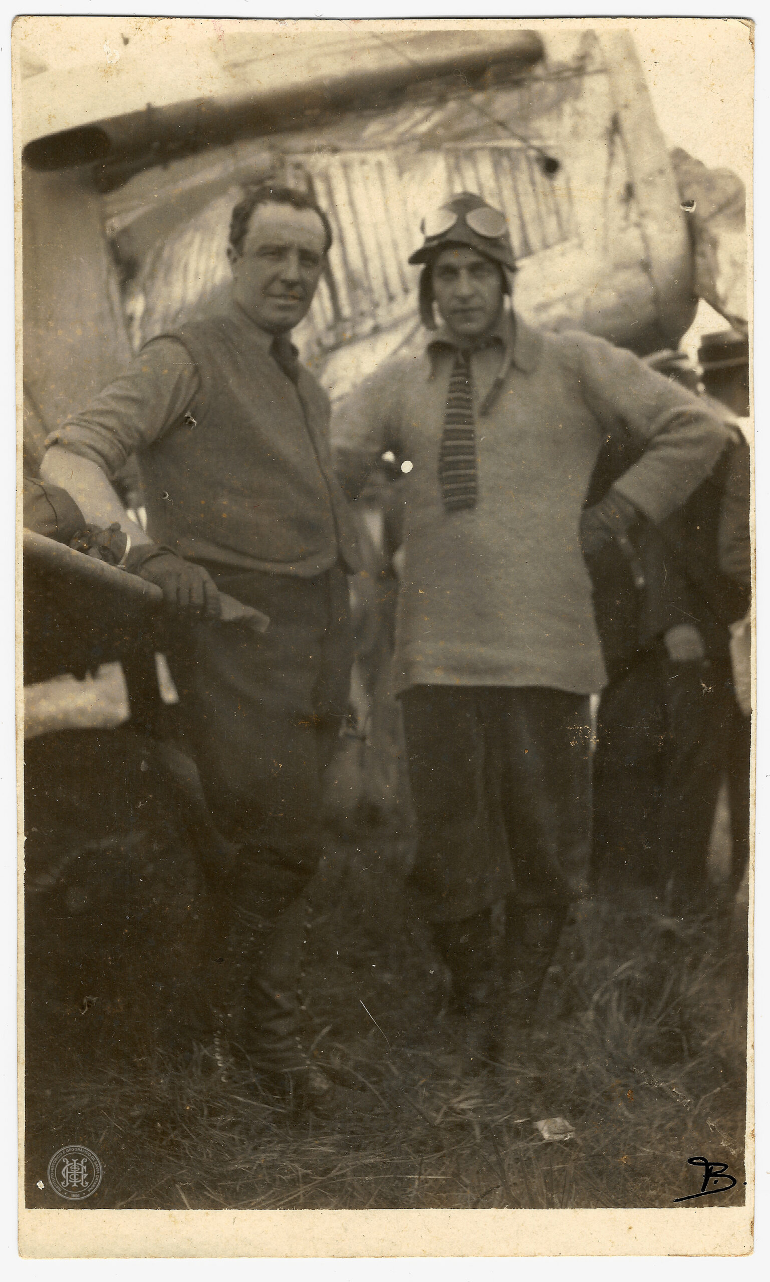 Dois indivíduos do sexo masculino posicionados à frente de uma aeronave. A imagem organiza-se com os sujeitos em primeiro plano, sobre um solo gramado e irregular. O homem à esquerda, em postura frontal, traja camisa de mangas compridas com punhos dobrados, colete de tonalidade média, calças de montaria e botas de couro de cano alto com amarração; seu braço direito está apoiado sobre uma estrutura metálica escura que adentra o quadro pela lateral esquerda. O homem à direita, também em posição frontal e com as mãos na cintura, veste um casaco de lã ou suéter de cor clara, gravata com listras horizontais escuras, calças de montaria e botas de cano alto; ele utiliza um gorro de aviador em couro com óculos de proteção (goggles) de lentes circulares posicionados sobre a testa.