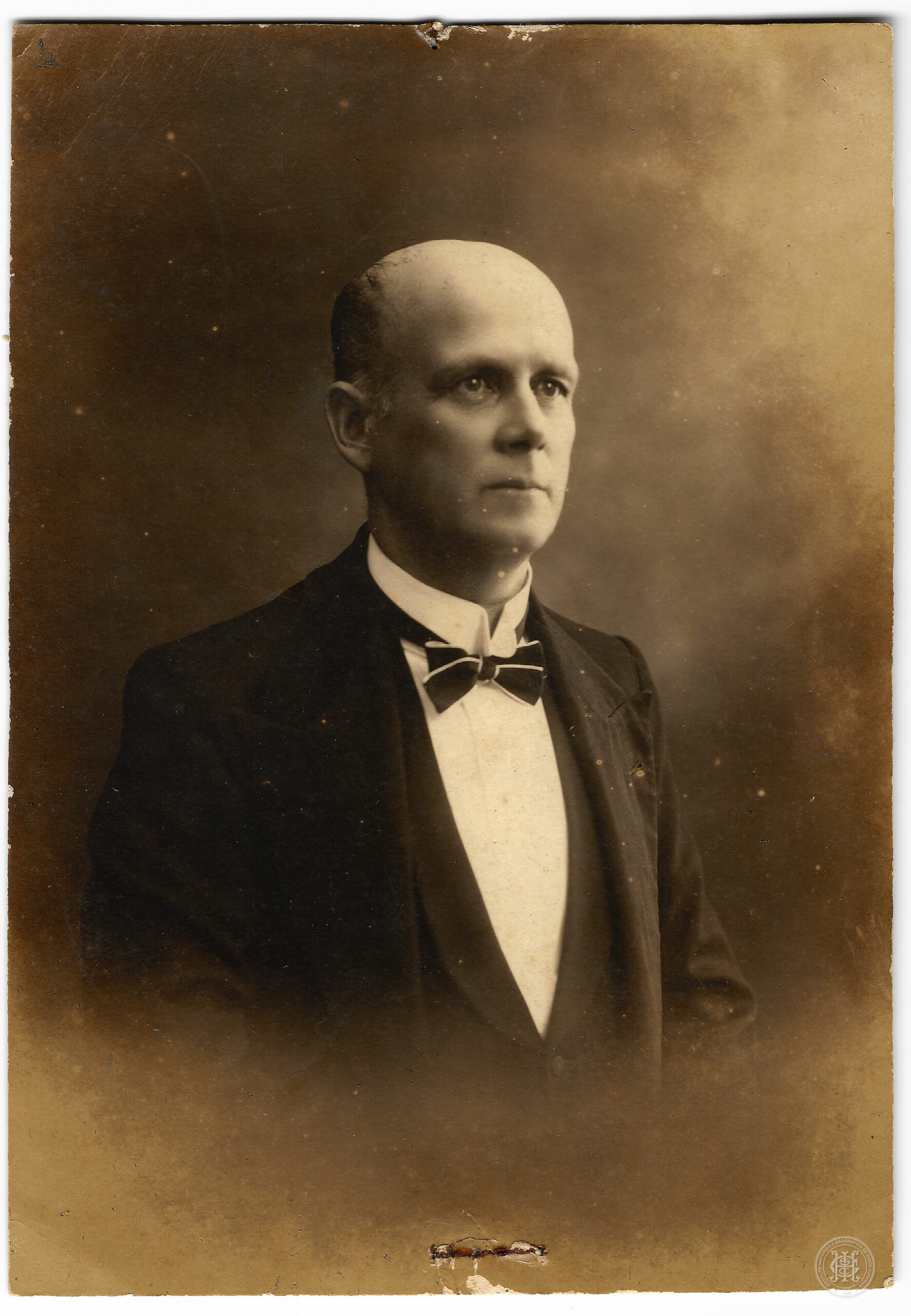 Retrato individual, Retrato masculino, Carlos Wendhausen, Dr. Carlos Wendhausen, Autoridades e Personalidades, Elite, Indumentária formal, Paletó, Colete, Gravata borboleta, Calvície, Século XX, Fotografia de estúdio, Gênero Retrato