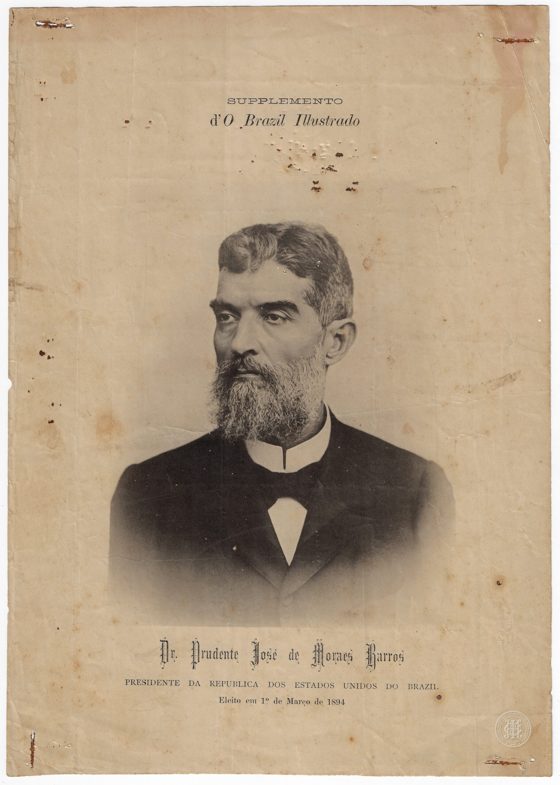 Na parte superior, consta a inscrição "SUPPLEMENTO d'O Brazil Illustrado" em tipografia serifada. Na porção inferior, o nome "Dr. Prudente José de Moraes Barros" está grafado em letras góticas estilizadas, seguido pelas legendas "PRESIDENTE DA REPUBLICA DOS ESTADOS UNIDOS DO BRAZIL" e "Eleito em 1º de Março de 1894".