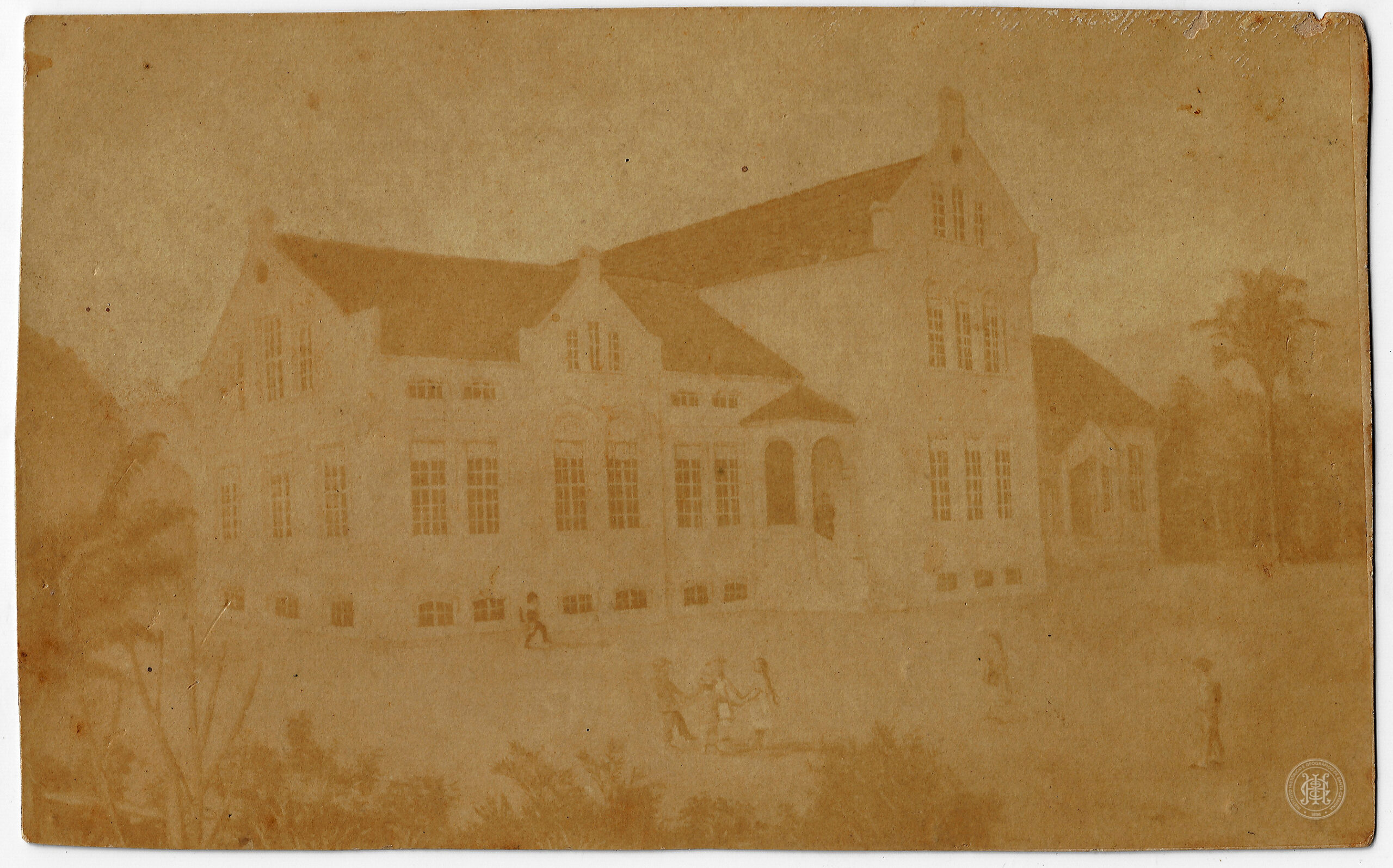 No primeiro plano, observa-se uma área de pátio ou logradouro plano, onde figuram pequenas silhuetas humanas dispersas, sugerindo a escala monumental do edifício. No plano de fundo, à direita, nota-se a presença de uma palmeira isolada, enquanto a esquerda é delineada por massas de vegetação arbustiva.