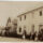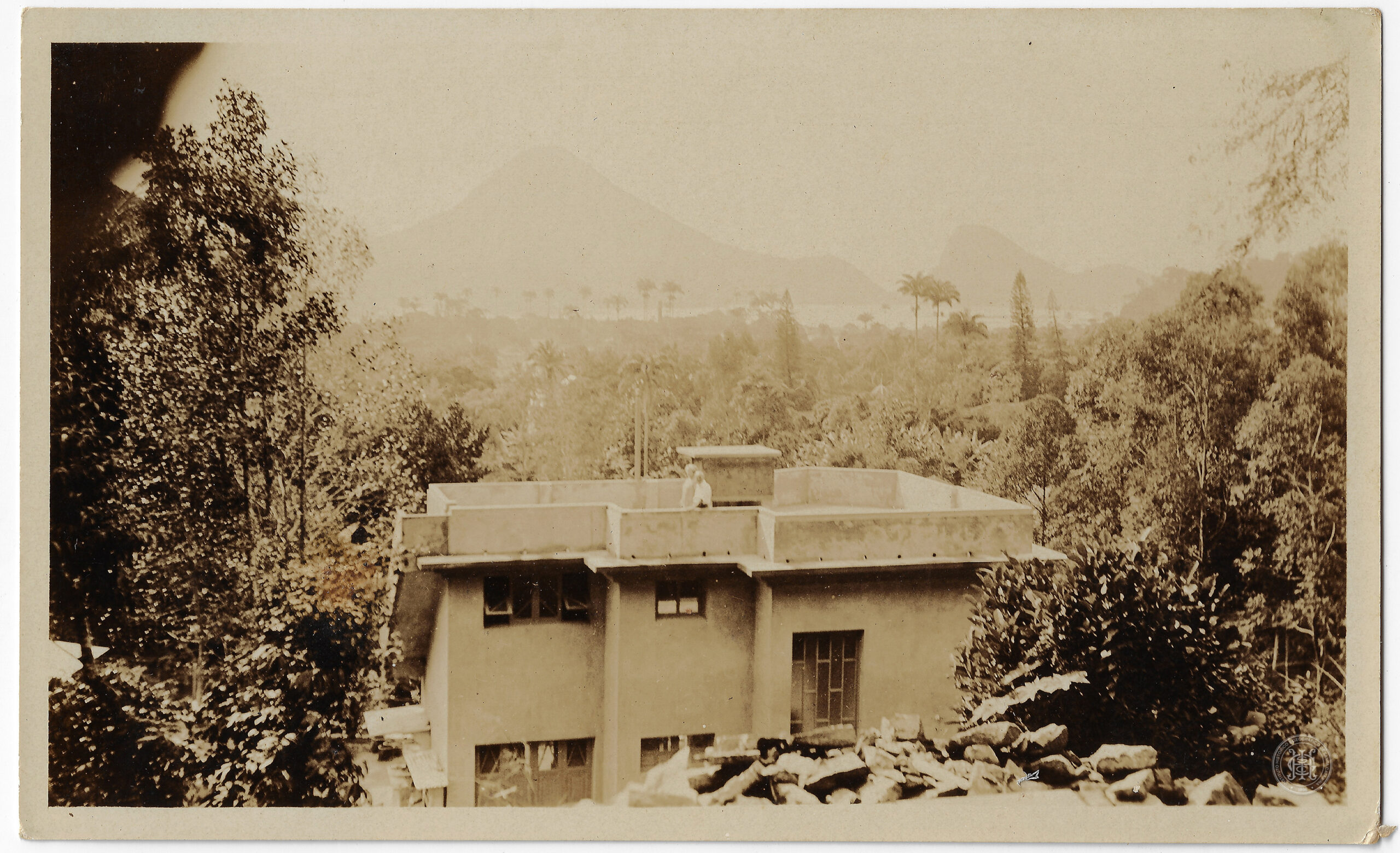 Registra uma edificação residencial de arquitetura moderna, situada em um terreno elevado e cercada por densa vegetação, provavelmente localizada no Rio de Janeiro levando em conta a geografia e o relevo apresentado na fotografia. Em primeiro plano, observa-se a parte superior de um muro ou encosta composta por pedras irregulares amontoadas, que obstruem parcialmente a base do imóvel. A residência, localizada no plano médio, possui dois pavimentos e uma cobertura em terraço plano (platibanda), onde se avistam duas figuras humanas de pequeno porte e trajes claros próximas a uma estrutura retangular que se assemelha a uma chaminé ou reservatório. A fachada apresenta janelas retangulares com esquadrias escuras e uma porta ou portão de grandes dimensões no pavimento inferior, à esquerda.