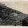 O plano de fundo é composto por uma vasta paisagem natural e rural. Identifica-se uma densa massa arbórea com diferentes tipologias, incluindo palmeiras e árvores de copas altas, que se estendem até a linha do horizonte. Ao fundo, destacam-se formações de relevo proeminentes, com um morro de formato cônico centralizado e outra elevação menor à direita, cujos contornos sugerem uma região de vale ou encosta de serra. A composição é emoldurada lateralmente por folhagens em primeiro plano, conferindo profundidade à cena, que captura uma integração entre a construção civil e o ambiente natural.