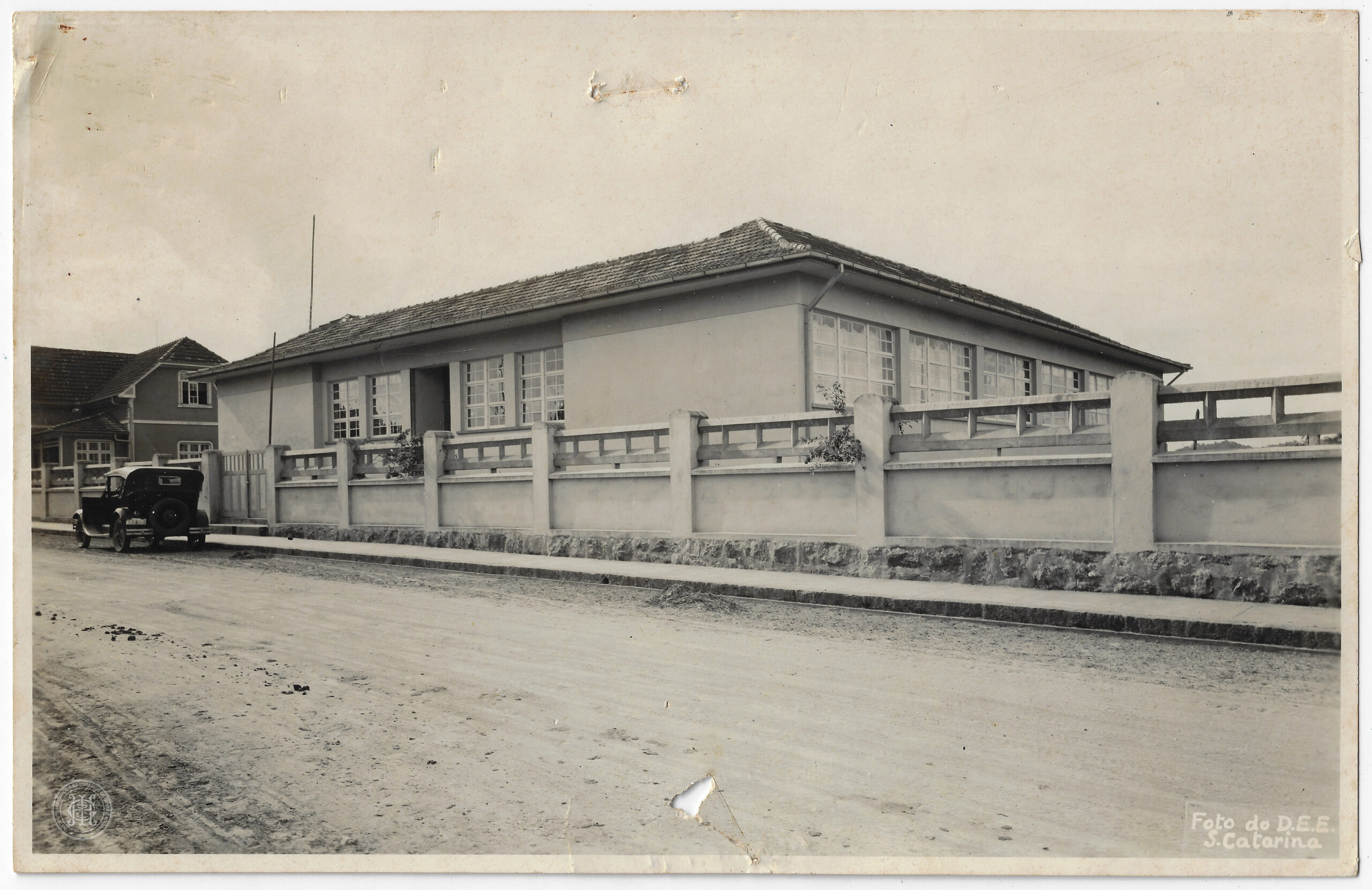 Ao fundo, à esquerda, é visível parte de uma residência com telhado de duas águas e janelas com molduras claras. No canto inferior direito do suporte, há uma legenda impressa em cor branca com o texto "Foto do D.E.E. S. Catarina".