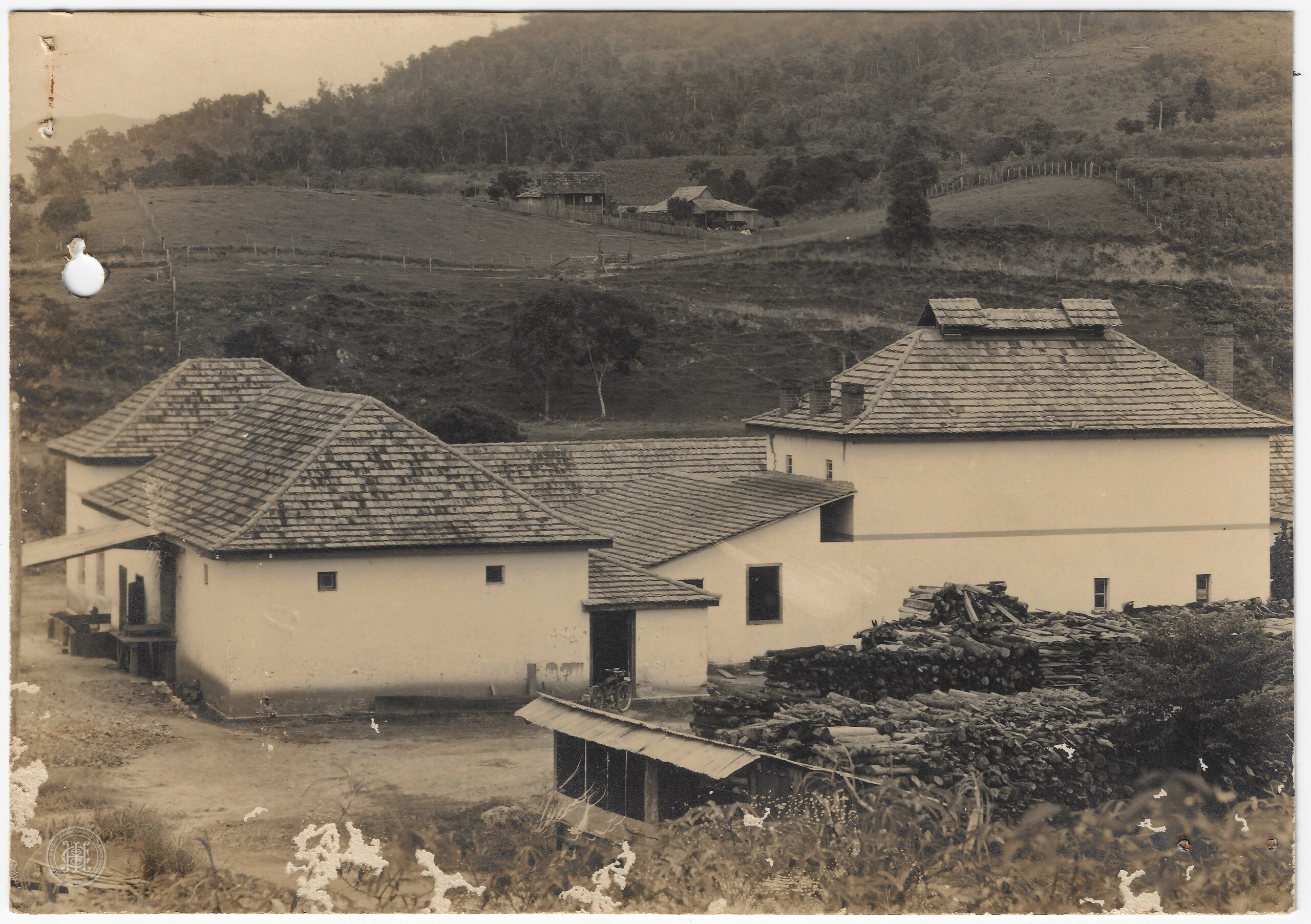 Fotografia registrando um complexo de edificações funcionais na localidade de Hamônia, atual município de Ibirama, Santa Catarina.