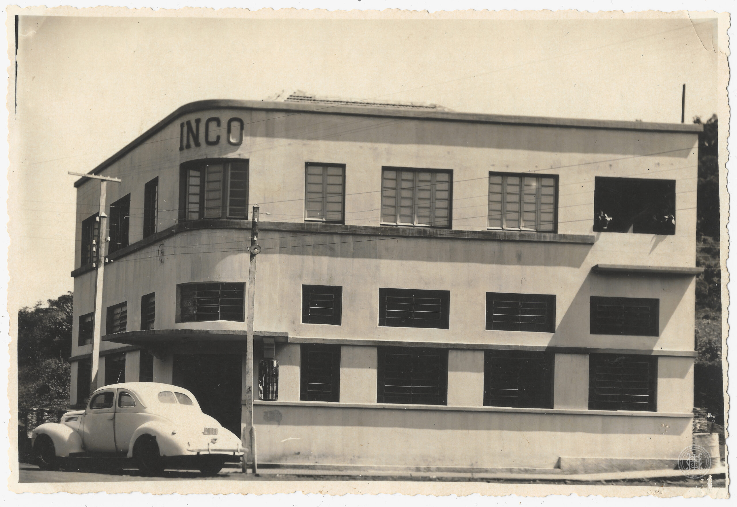 Edifício do Banco da Indústria e do Comércio (INCO) em Joaçaba, Santa Catarina. A composição centraliza uma edificação de dois pavimentos com telhado de telhas cerâmicas e platibanda decorada. A fachada principal, situada em uma esquina, apresenta no topo a inscrição em relevo "BANCO DA INDUSTRIA E DO COMERCIO S/A" e, logo abaixo, a sigla "INCO".