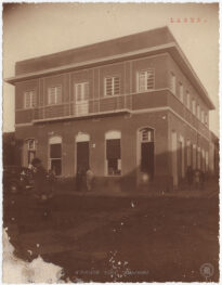 Uma sacada com guarda-corpo metálico simples projeta-se sobre a fachada principal, acessada por uma porta central. No plano médio, em frente ao edifício, observam-se figuras humanas masculinas em pé e a lateral de um automóvel escuro estacionado à esquerda. A composição é finalizada por um logradouro em primeiro plano e a lateral da edificação que se estende para a direita da imagem, sob um céu claro.