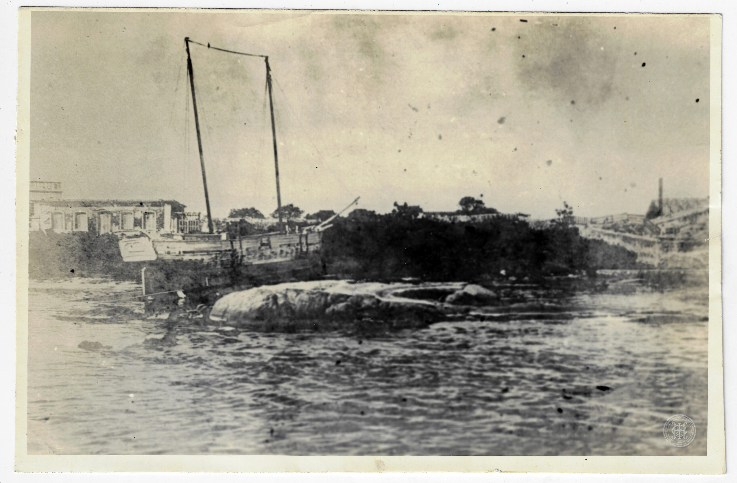 Cena marítima em Laguna, Santa Catarina, destacando a embarcação Seival. No primeiro plano, as águas de um canal ou baía apresentam pequenas ondulações, com uma formação rochosa de superfície lisa e clara emergindo à esquerda do centro. No plano médio, a embarcação Seival, um barco de dois mastros, está posicionada lateralmente; sua estrutura revela um casco de madeira de tons claros e escuros, com o mastro de proa ligeiramente inclinado. À esquerda da embarcação, observa-se uma edificação de alvenaria com múltiplas janelas e detalhes arquitetônicos em relevo na parte superior, sugerindo uma construção de caráter institucional ou comercial histórico.