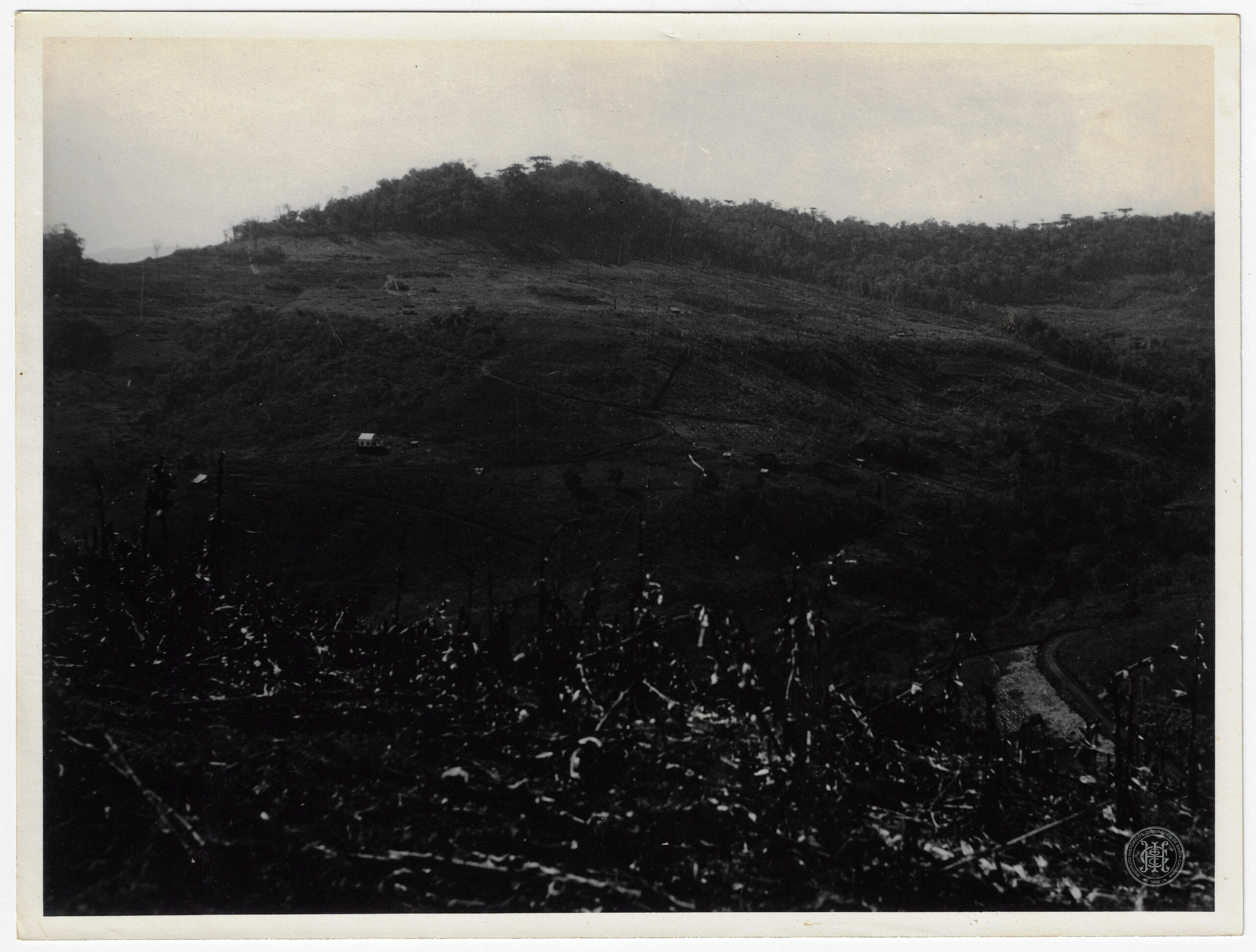 À direita, no nível inferior do vale, nota-se o traçado de uma estrada ou caminho que acompanha a base do morro. O plano de fundo é composto por uma elevação montanhosa com vegetação de mata densa no topo, sob um céu claro com iluminação difusa. A imagem documenta a integração entre a topografia acidentada e a exploração agrícola na região.