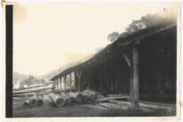 À esquerda, ao fundo, visualizam-se outras edificações de pequeno porte e pilhas de tábuas serradas dispostas verticalmente.