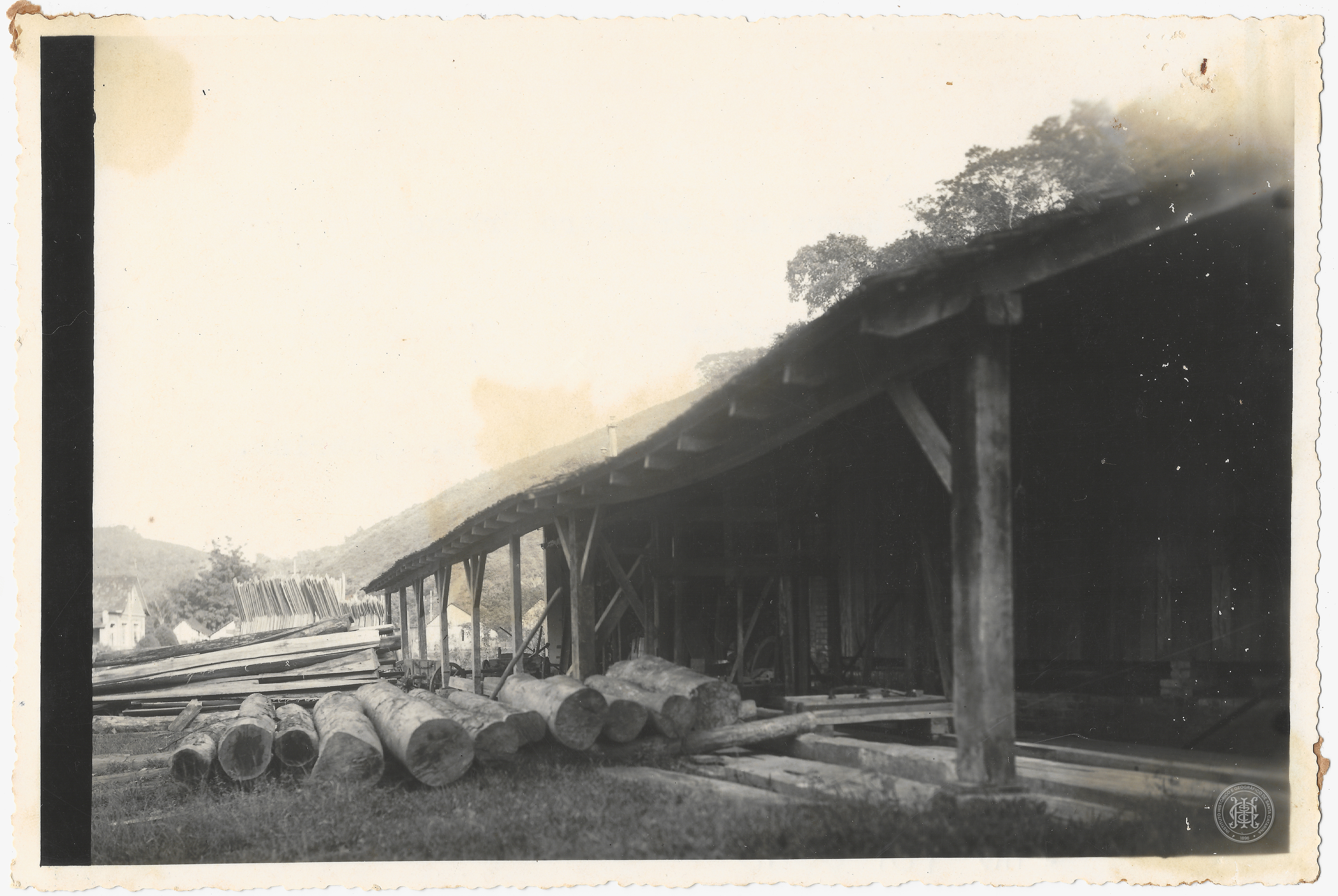 Patrimônio Industrial, Engenho de Serra, Serraria, Indústria, Produção fabril, Otto Schaefer, Brusque, Santa Catarina, Vale do Itajaí, Arquitetura de madeira, Edificações, Telhado cerâmico, Toras, Madeira, Matéria-prima, Perímetro urbano, Trabalho e Atividades Econômicas, Economia regional, Paisagem Urbana, Fotografia documental