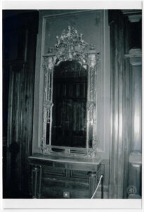 Fotografia apresentando um espelho de grandes dimensões e estilo suntuoso, pertencente ao acervo do Palácio Cruz e Sousa, em Florianópolis, Santa Catarina.