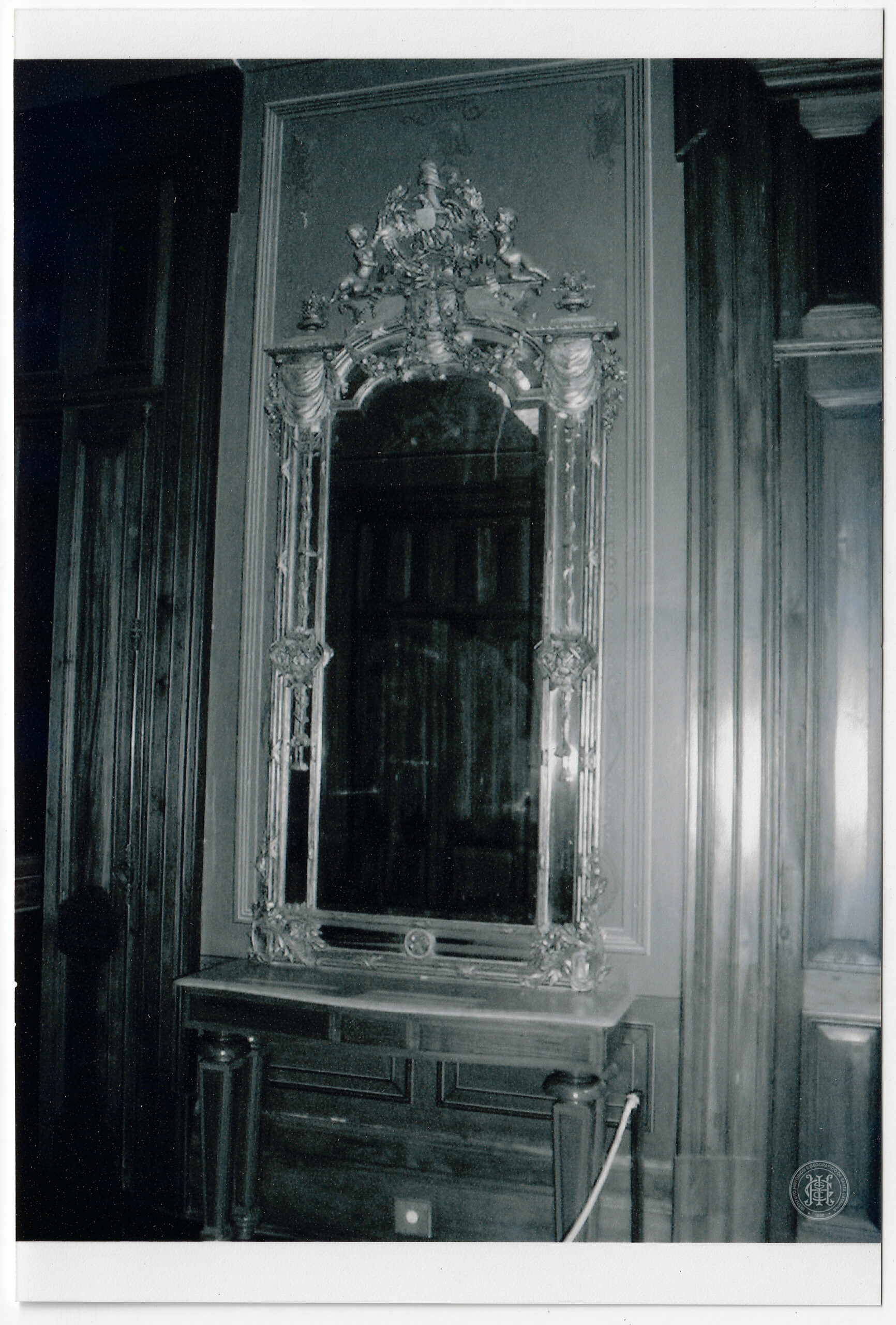 Florianópolis, Santa Catarina, Palácio Cruz e Sousa, Museu Histórico de Santa Catarina, espelho, moldura decorada, talha em madeira, querubins, console, tampo de mármore, boiserie