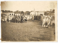 "Parada Escolar" em comemoração ao dia 7 de setembro de 1939, no município de Jaguaruna, Santa Catarina. A imagem, capturada a partir de um plano levemente elevado e gramado em primeiro plano, apresenta uma concentração de pessoas organizada em um espaço aberto.