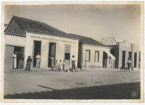 Perspectiva de rua com uma sequência de edificações comerciais e residenciais na cidade de Jaguaruna, Santa Catarina. Em primeiro plano, observa-se uma via de chão batido com a presença de diversas figuras humanas posicionadas estaticamente diante das construções. No plano médio, destaca-se uma edificação térrea de cor clara, com telhado de telhas cerâmicas e múltiplas aberturas, que ostenta na fachada a inscrição pintada: "SOCIEDADE COMERCIAL AGRICOLA JAGUARUNENSE LTDA A UNICA NO GENERO".