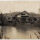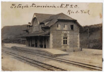 À esquerda, estende-se uma área plana de chão batido com a presença de um pequeno poste de iluminação e a silhueta de uma pessoa caminhando ao longe. Na parte superior da fotografia, há inscrições manuscritas a tinta preta: no canto superior esquerdo, lê-se "Estação Ferroviária - E.F.S.C."; e no canto superior direito, "Rio do Sul".