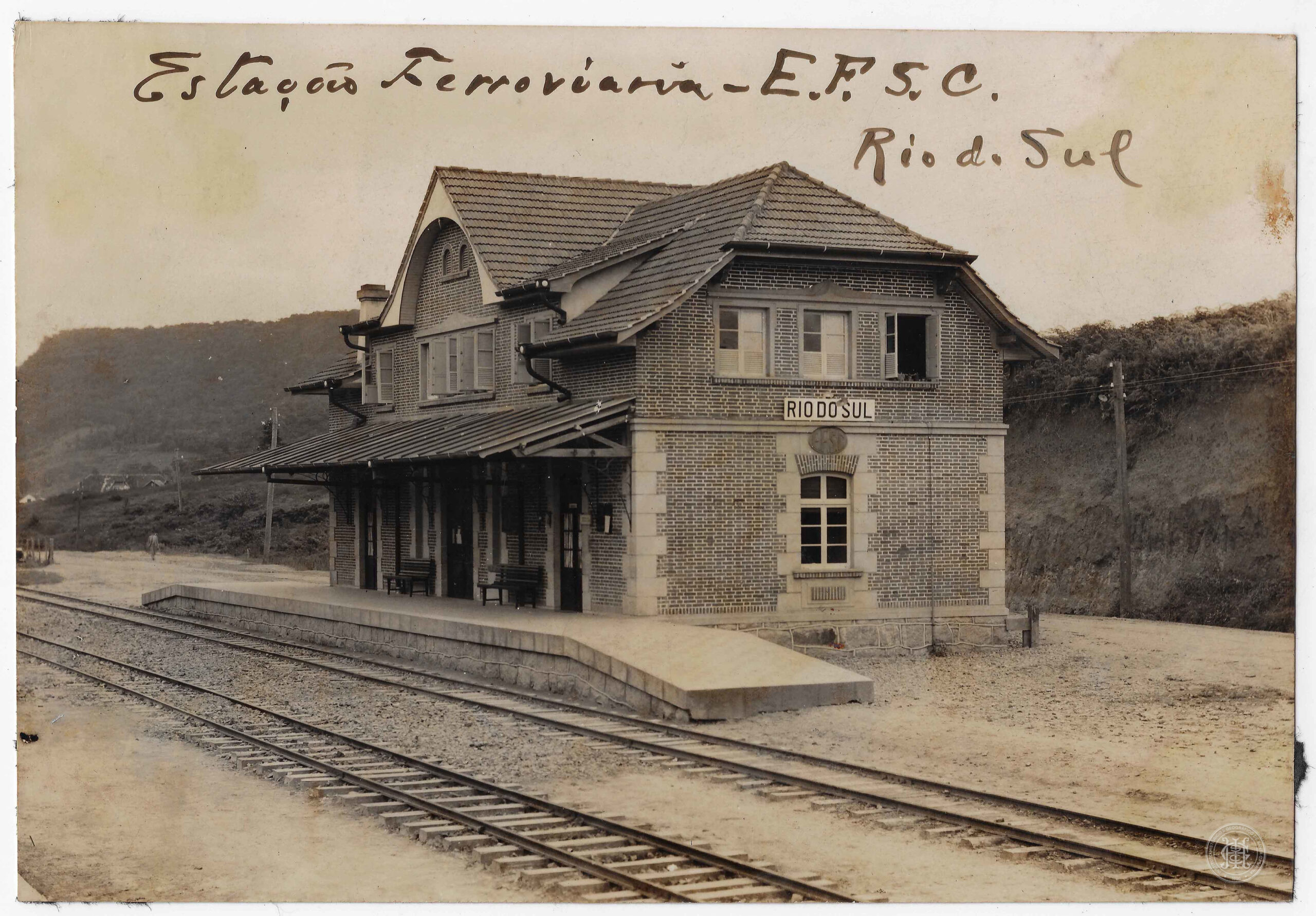 Paisagem Urbana, Arquitetura, Estação Ferroviária, Edificação Pública, Estrada de Ferro Santa Catarina, E.F.S.C., Trilhos, Plataforma de Embarque, Varanda, Tijolos Aparentes, Telhado Cerâmico, Inscrição na Fachada, Manuscrito na Fotografia, Rio do Sul, Santa Catarina, Vale do Itajaí