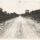 À direita, um corte de terreno elevado exibe solo exposto e texturizado. A estrada, de superfície clara e composta por terra e cascalho, estende-se em direção ao centro da imagem, seguindo em linha reta por um declive que desaparece no horizonte.