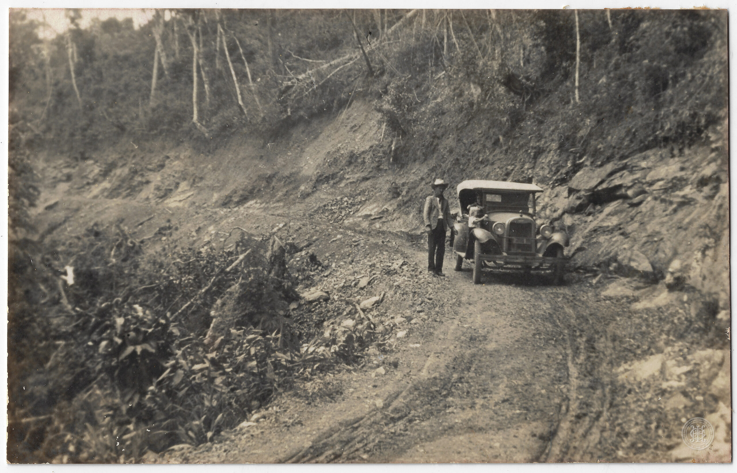 Serra do Rio do Bispo-Itajaí, Estrada municipal, Estrada de rodagem, Itaiópolis, Moema, Santa Catarina, Automóvel antigo, Veículo motorizado, Transporte rodoviário, Homem, Chapéu, Indumentária, Serra, Encosta, Relevo, Montanha, Mata Atlântica, Floresta, Vegetação nativa, Logradouros e Lugares Urbanos, Infraestrutura e Engenharia, Rodovias e Estradas, Fotografia documental, Suporte de papel, Cartão-postal