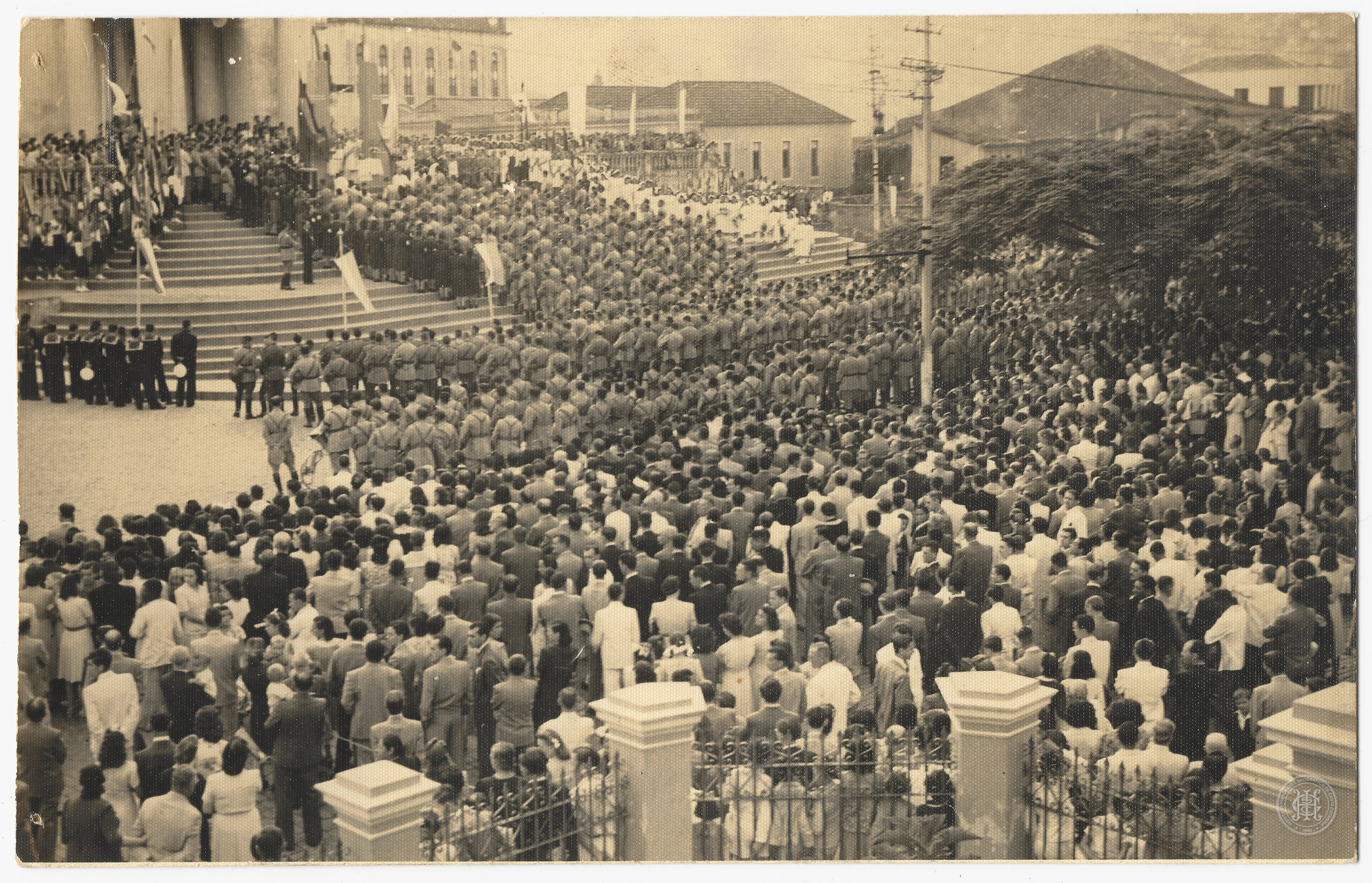 No plano médio, uma vasta massa de soldados uniformizados organiza-se em colunas e fileiras compactas, ocupando a área central e subindo as escadarias laterais da Catedral. No canto superior esquerdo, sobre o patamar elevado das escadarias, vislumbram-se autoridades e porta-bandeiras próximos ao local da celebração conduzida pelo Arcebispo Dom Joaquim Domingues de Oliveira. À direita, a composição é preenchida por uma multidão de civis e pela copa de uma árvore, enquanto ao fundo surgem edificações urbanas e postes de fiação elétrica sob um céu claro.
