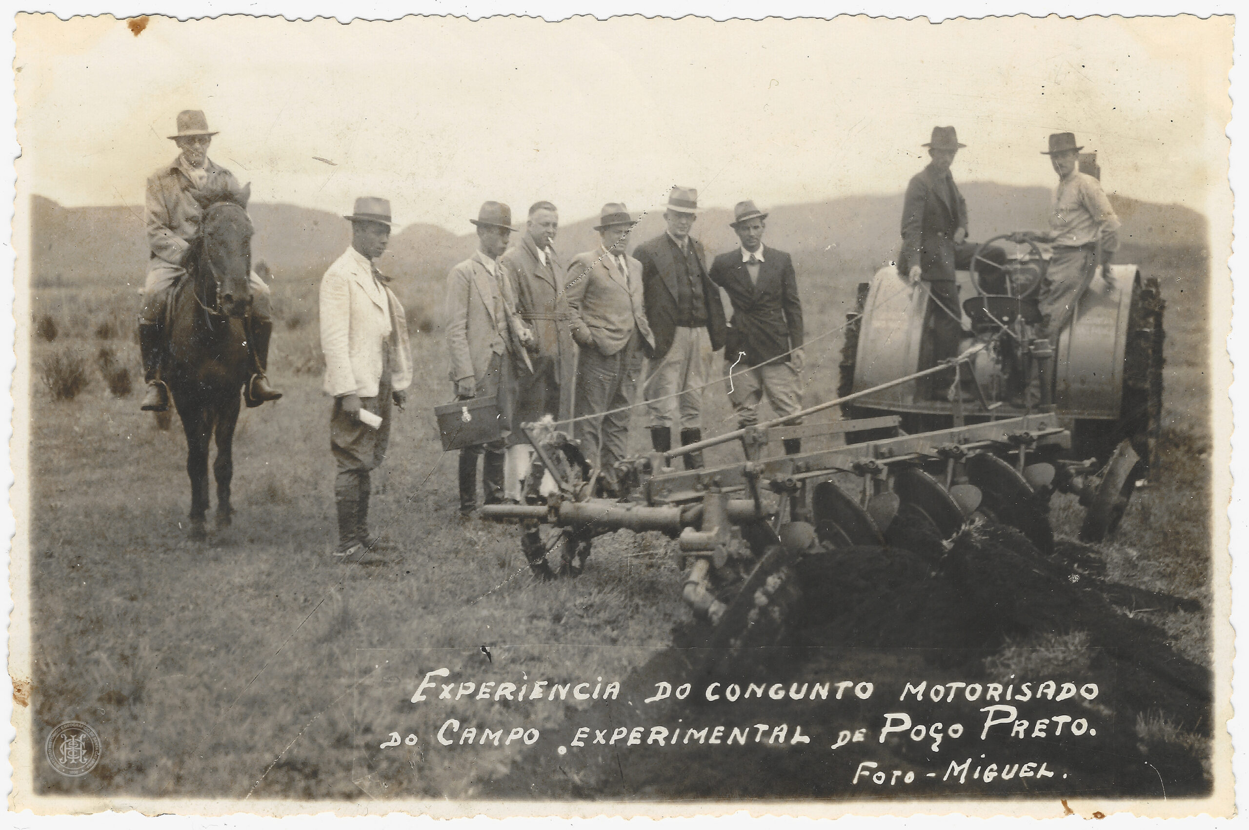 No primeiro plano, à direita, destaca-se um arado de discos acoplado a um trator motorizado, operado por um homem sentado. No plano médio, um grupo de sete homens traja fatos formais e chapéus, observando a operação; à esquerda, um oitavo homem está montado a cavalo, também de chapéu e traje de montaria. O terreno é composto por vegetação rasteira e, ao fundo, observa-se uma linha de morros sob um céu claro.