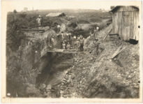 Mineração, Extração de Carvão, Mina a Céu Aberto, Mina de Dia, Trabalhadores, Operários, Ferramentas de Trabalho, Picareta, Pá, Estruturas de Madeira, Galpão de Palha, Passarela de Madeira, Geologia, Rejeitos, Criciúma, Santa Catarina, Sul Catarinense, Economia Extrativista, Trabalho Manual,