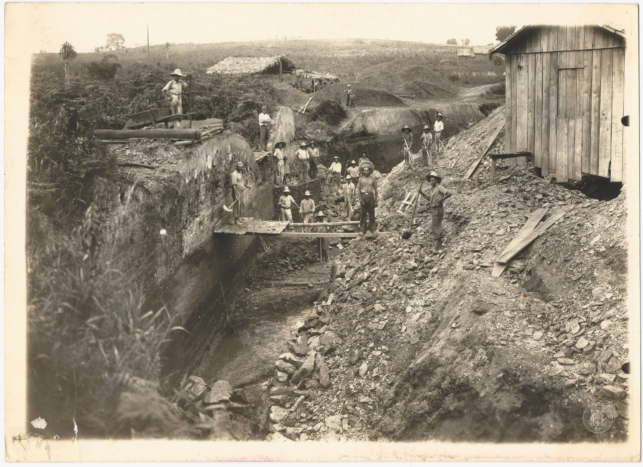 A imagem apresenta uma cena complexa de trabalho extrativista em um terreno acidentado com cortes profundos no solo. No primeiro plano, à direita, observa-se uma edificação rústica de madeira com telhado de duas águas, posicionada sobre um aterro de pedras e rejeitos. No centro, uma profunda vala de extração revela as camadas geológicas da encosta, atravessada por uma passarela estreita e improvisada de madeira, sobre a qual dois trabalhadores permanecem em pé. Diversos homens, trajando calças, camisas de mangas compridas e chapéus de abas largas, estão distribuídos por diferentes níveis da mina, alguns portando ferramentas de trabalho como pás e picaretas.