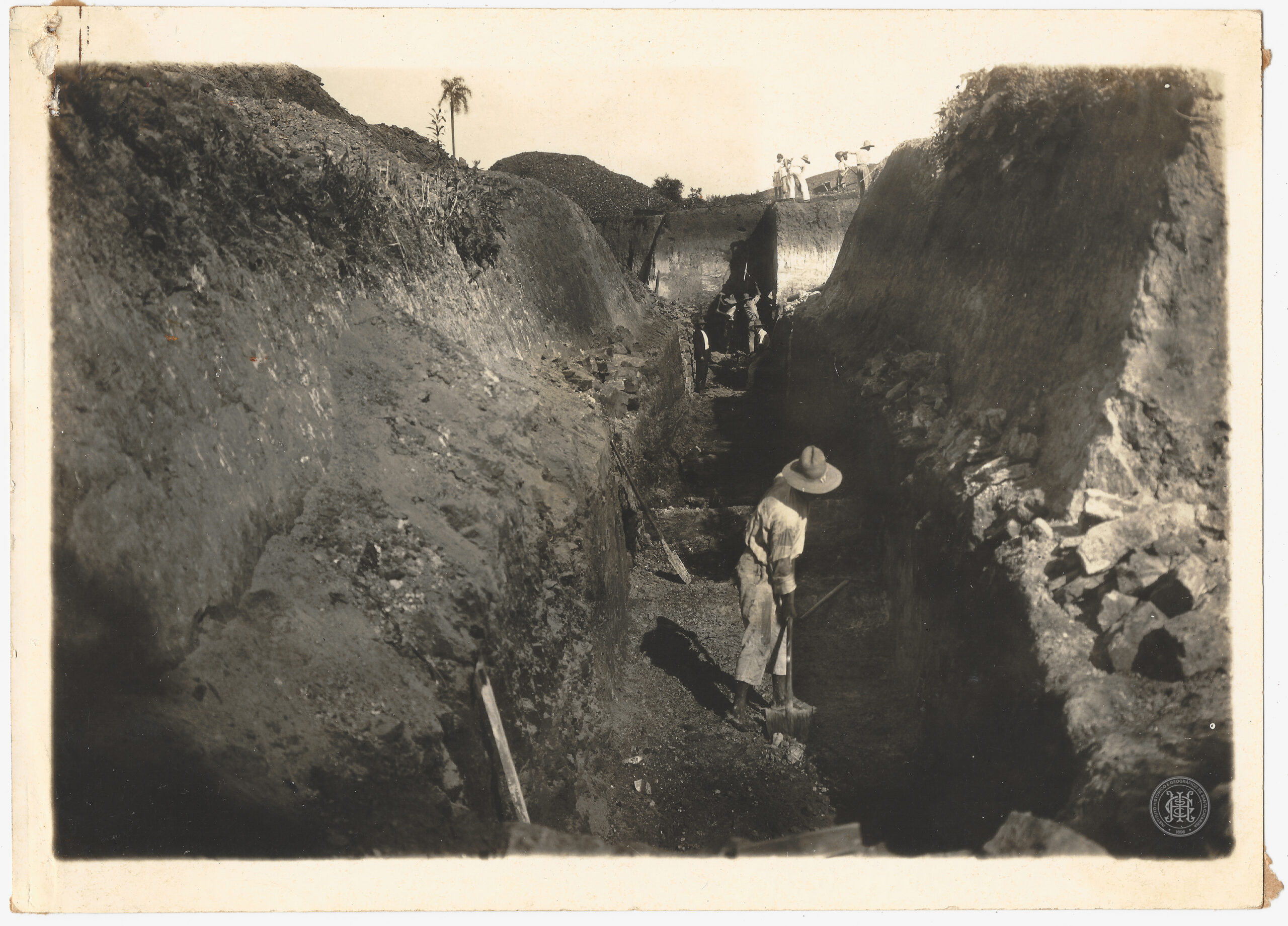 A imagem é estruturada por um plano de corte profundo no terreno, formando um corredor ladeado por altas encostas de terra e rocha. No primeiro plano, à direita, um trabalhador de perfil, utilizando chapéu de abas largas e vestimenta clara, manuseia uma ferramenta de escavação no fundo da vala. No plano médio, ao longo do corredor escavado, observam-se outros trabalhadores em atividades de extração e movimentação de material.