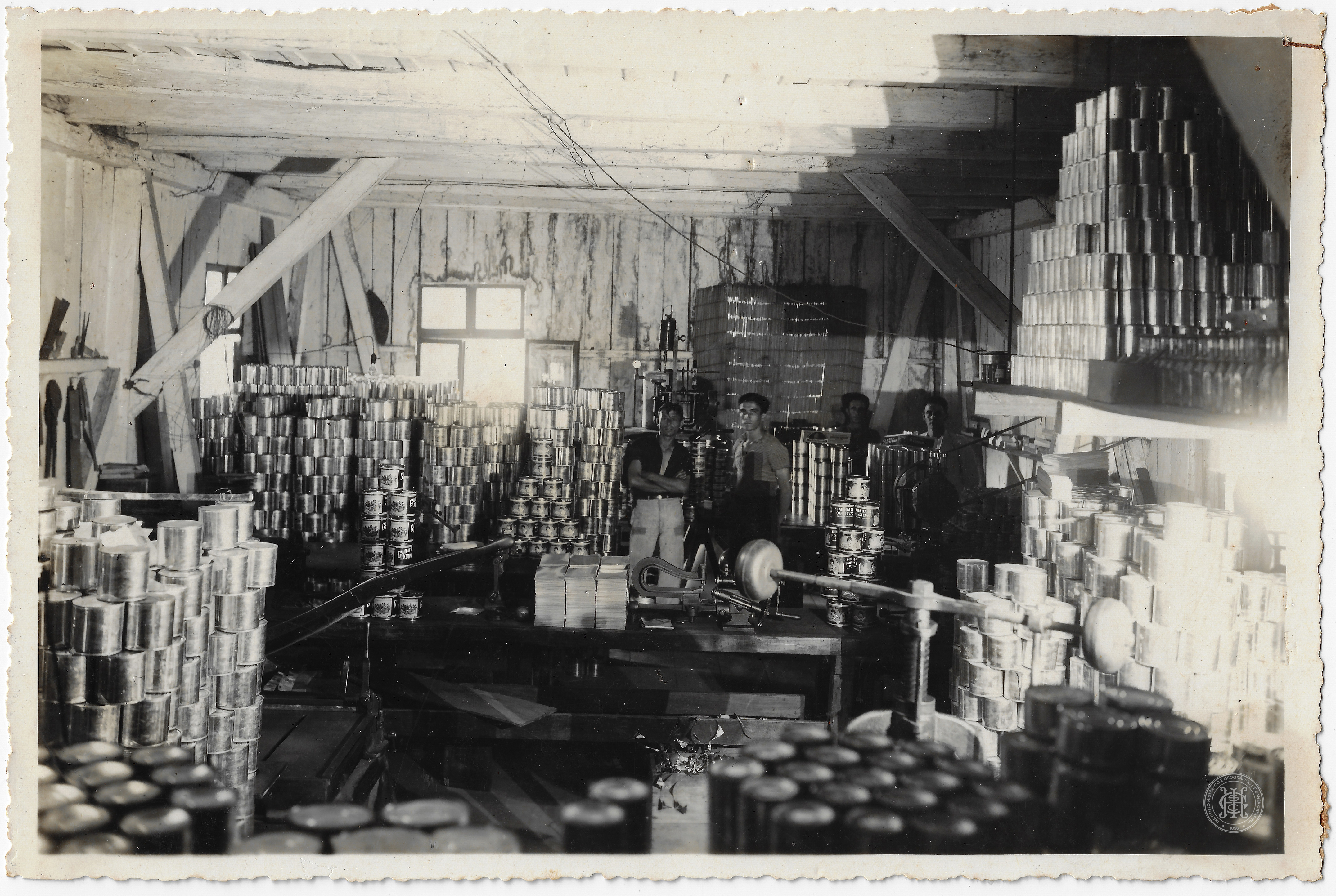 Brusque, Santa Catarina, Vale do Itajaí, Fábrica de Conservas Kormann, Indústria de Alimentos, Conservas, Patrimônio Industrial, Produção fabril, Estoque, Latas, Embalagens metálicas, Trabalhadores, Operários, Grupo de pessoas, Indumentária, Avental, Trabalho e Atividades Econômicas, Instalações Industriais, Arquitetura Industrial, Galpão, Estrutura de madeira, Interior de Edifício