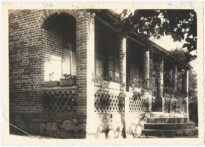 Em primeiro plano, à direita, observa-se uma escada semicircular composta por quatro degraus que conduz à varanda. A varanda é delimitada por um guarda-corpo de treliça de madeira ou cerâmica em padrão de losangos, guarnecido por floreiras com vegetação ornamental. A estrutura da cobertura é sustentada por colunas cilíndricas também de tijolos aparentes.