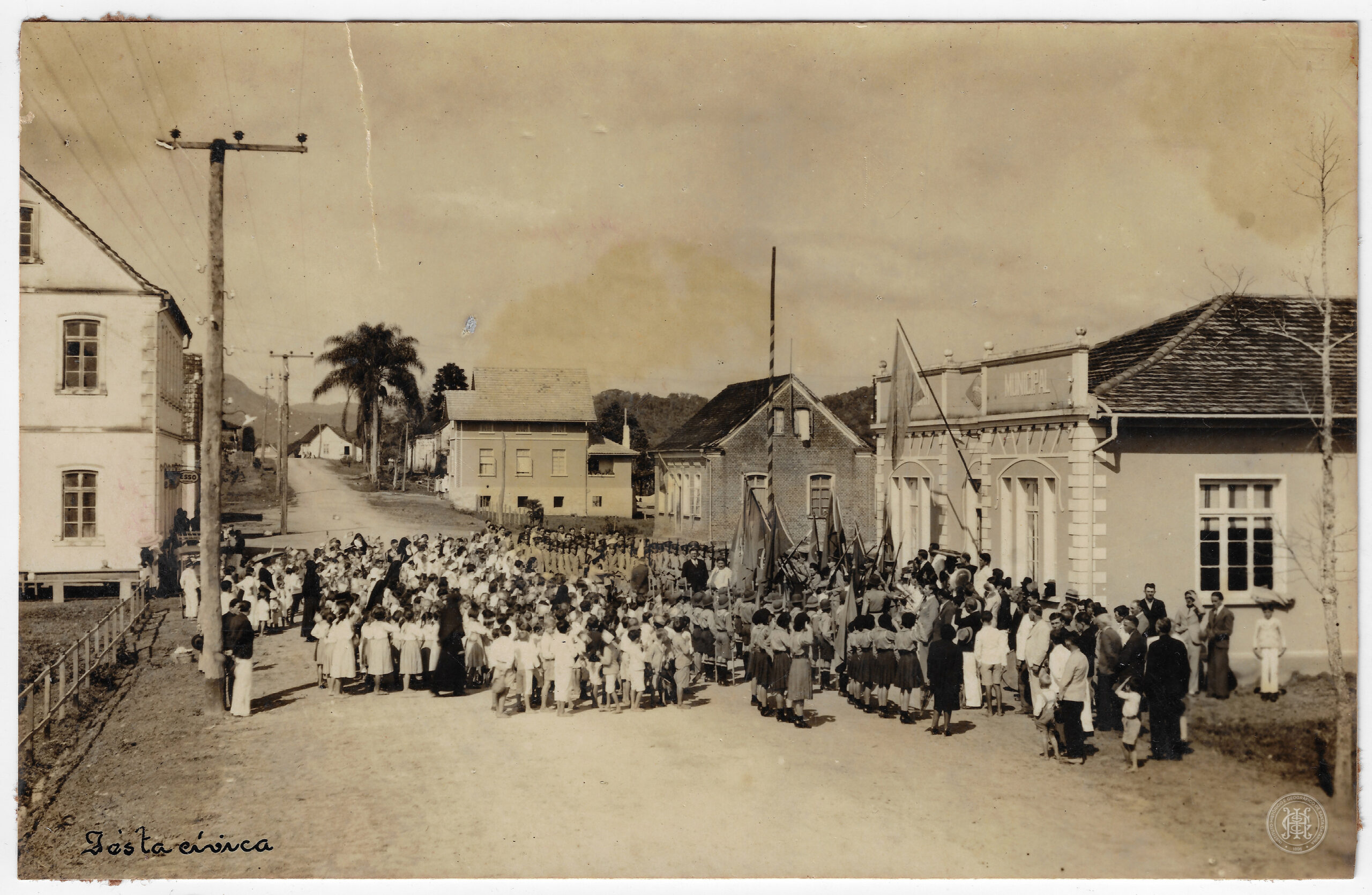 Momento de uma "Festa cívica" em Rodeio, Santa Catarina, defronte ao edifício da Prefeitura Municipal. A composição apresenta, em primeiro plano à esquerda, uma via de terra batida ladeada por uma cerca de madeira.