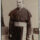 O cenário de estúdio é composto por elementos decorativos típicos do século XIX. O plano de fundo apresenta uma cortina pesada e drapeada à esquerda e uma parede de tom neutro ao centro e à direita. O chão é coberto por um tapete com padrões florais detalhados.
