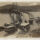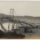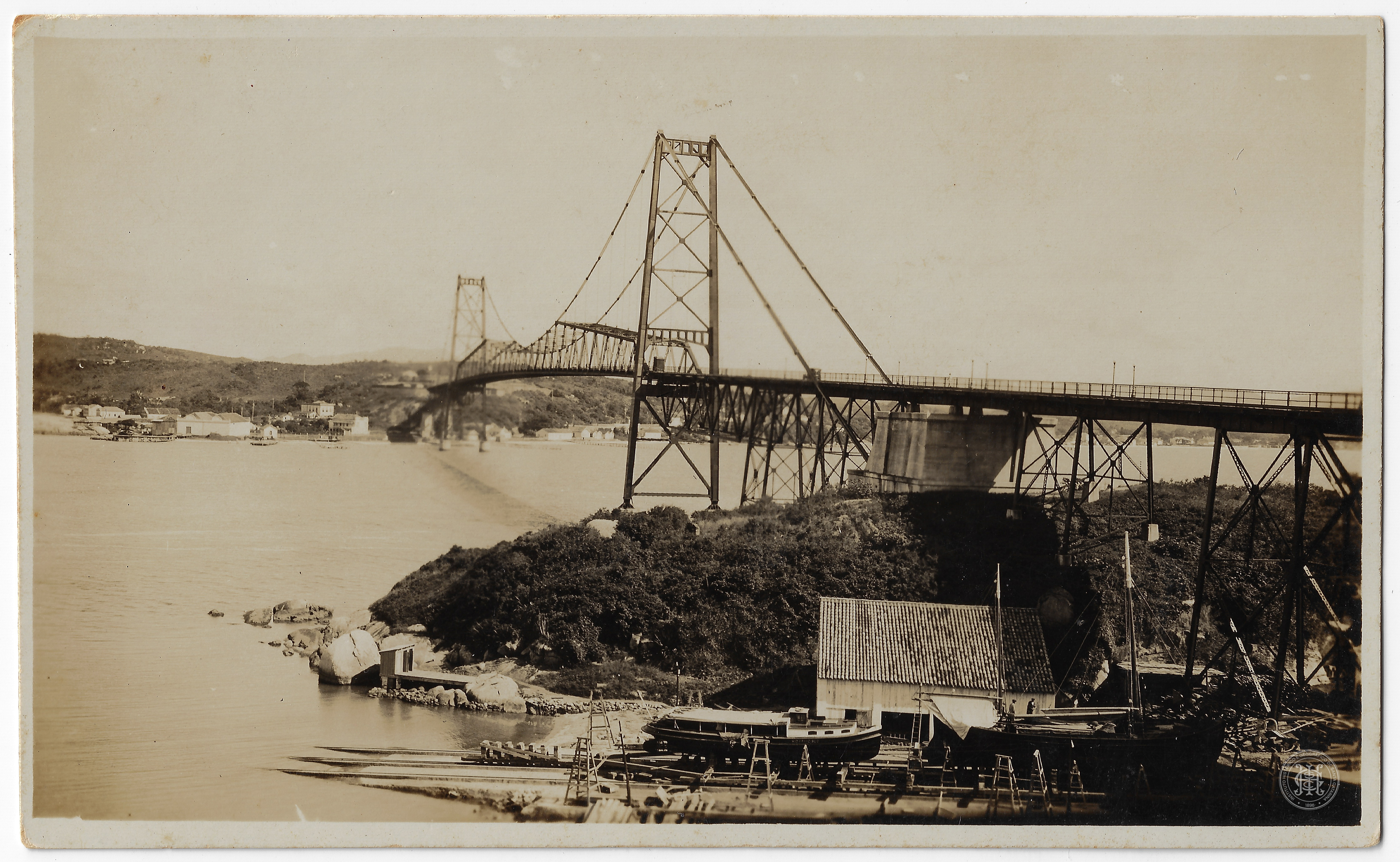 A composição apresenta, em primeiro plano à direita, uma área de estaleiro com embarcações em manutenção sobre trilhos e suportes de madeira, próximas a uma edificação de pequeno porte com telhado de duas águas. No plano médio, destaca-se a estrutura metálica pênsil da ponte, sustentada por torres de treliça, que atravessa o canal marítimo.