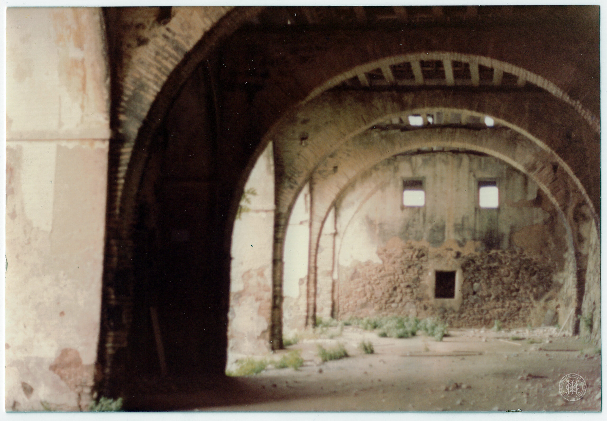 Interior em ruínas de uma edificação na Fortaleza de Santa Cruz de Anhatomirim, em Governador Celso Ramos, Santa Catarina. A composição é estruturada por uma sequência de quatro arcos plenos de alvenaria que sustentam um teto de vigas de madeira aparentes, criando uma perspectiva de profundidade que conduz o olhar do primeiro plano à esquerda para o plano de fundo à direita. O pavimento é de terra batida, apresentando acúmulo de detritos e o crescimento de vegetação rasteira (ervas daninhas) entre as bases das colunas e ao longo do corredor.