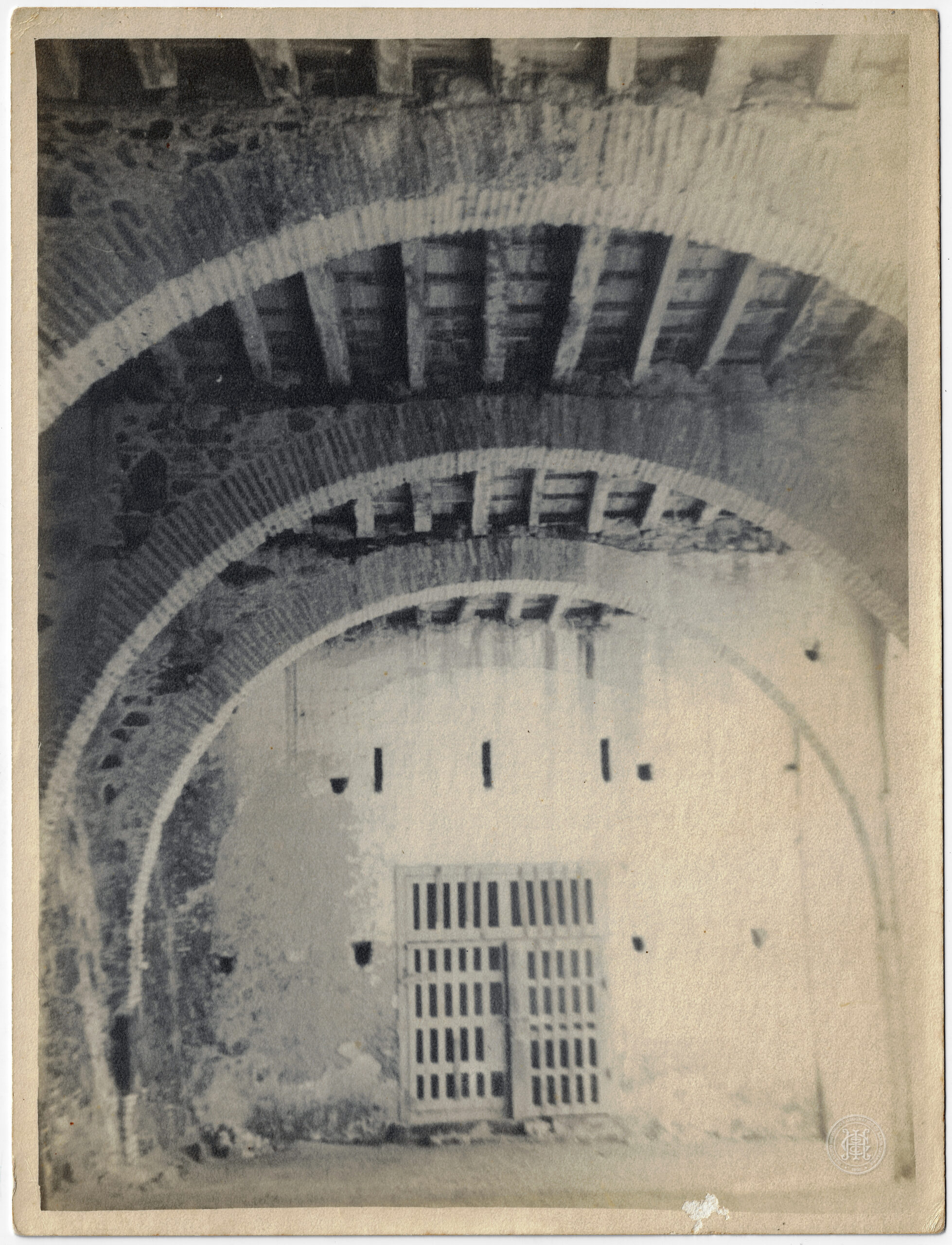 No plano de fundo, a perspectiva encerra-se em uma parede clara, possivelmente caiada, que apresenta pequenas aberturas retangulares de ventilação ou seteiras dispostas horizontalmente. Abaixo destas aberturas, centraliza-se uma porta de madeira com estrutura em grelha ou gradil vertical, reforçando a tipologia de arquitetura militar e de confinamento. A iluminação provém da parte frontal e superior, projetando sombras marcadas sob as vigas de madeira e ressaltando a volumetria das arcadas. O enquadramento é centralizado, capturando a simetria das aberturas e o aspecto monumental da fortificação.