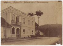 Em frente ao edifício, na via de terra batida, observa-se uma carroça tracionada por um cavalo e uma figura infantil em pé. O entorno inclui uma palmeira imperial de grande porte à direita do prédio, outras construções residenciais ao fundo e uma encosta arborizada que compõe a linha do horizonte sob um céu claro. À esquerda, nota-se um poste de madeira com fiação elétrica.