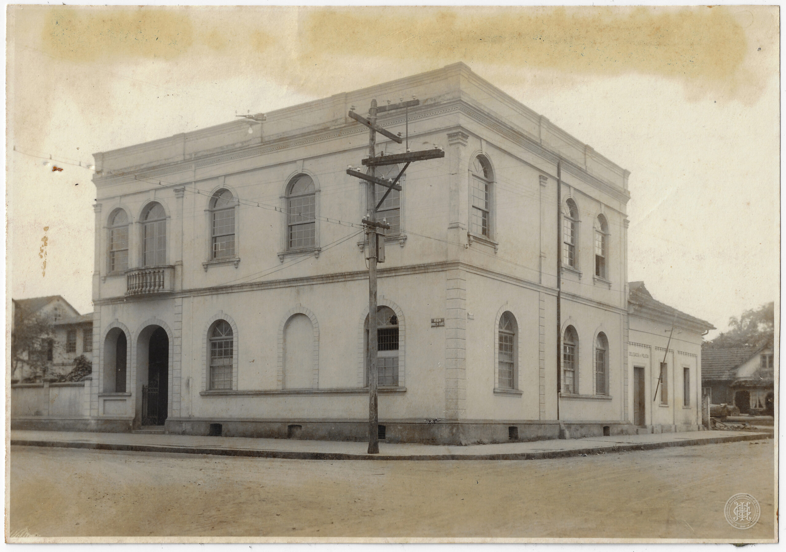 Arquitetura, Edificações Públicas, Fórum de Joinville, Delegacia de Polícia, Joinville, Santa Catarina, Rua Princesa Isabel, Arquitetura Eclética, Pavimentos, Janelas de arco pleno, Balaustrada, Balcão, Poste de iluminação, Fiação elétrica, Infraestrutura urbana, Logradouro, Esquina, Urbanização, Setembro de 1939, Século XX, Fotografia documental, Patrimônio Edificado, Centro Histórico, Prédio administrativo, Paisagem urbana