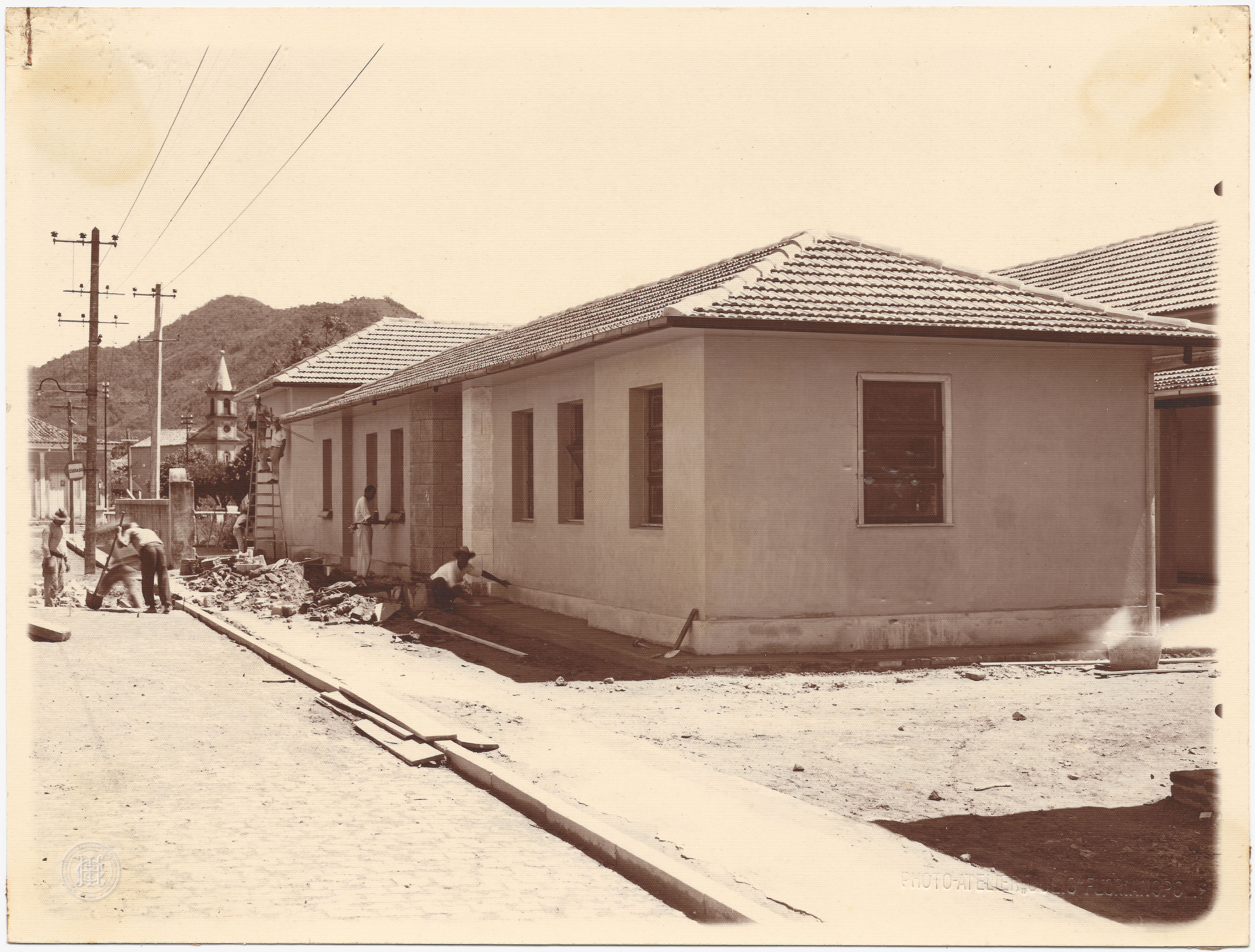 Construção Civil, Obra, Trabalhadores, Pedreiros, Servidores, Edificações, Alvenaria, Telhado Cerâmico, Arquitetura Civil, Urbanização, Calçada, Via de Terra, Logradouro, Biguaçu, Santa Catarina, Grande Florianópolis, Igreja, Pináculo, Torre, Morros, Relevo, Fiação Elétrica, Postes de Energia, Escada de Madeira, Fotografia Documental, Registro Histórico, Gênero Fotográfico, Photo Atelier "Julio" Florianópolis, Patrimônio Cultural