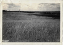 A composição organiza-se a partir de um plano detalhado de gramíneas em primeiro plano, que se estende por uma suave ondulação do terreno até o plano médio. No horizonte, observa-se uma linha divisória composta por uma densa massa de vegetação nativa à esquerda e uma área de campo aberto à direita, onde se vislumbram construções rurais isoladas.