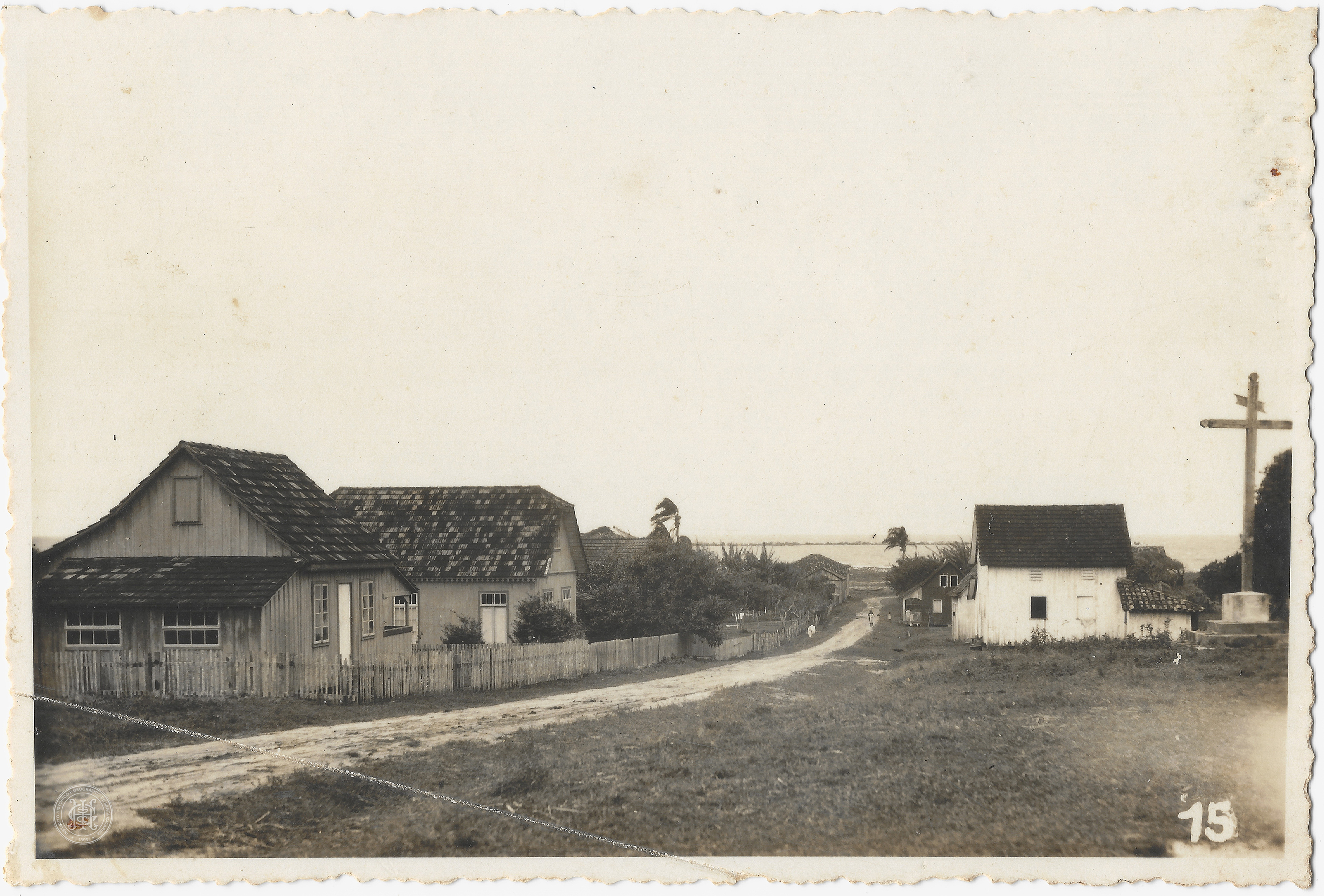 Gênero Fotográfico, Fotografia Documental, Cartão-postal, Paisagem Urbana, Paisagem Rural, Araquari, Santa Catarina, Arquitetura de Madeira, Patrimônio Privado e Residencial, Cruceiro, Patrimônio Religioso, Vias Públicas, Estradas de Terra, Cercas, Vegetação, Palmeiras, Urbanismo, Memória Social, Século XX, Foto Brasil Joinville, Documentação de Acervo, Logradouros e Lugares Urbanos