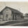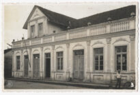 Esta fotografia em tons de cinza, com orientação horizontal, regista uma edificação de influência arquitetónica eclética localizada na cidade de Araquari, Santa Catarina. A imagem apresenta, em plano médio, uma construção de piso térreo com uma fachada extensa, caracterizada por uma sequência rítmica de sete aberturas retangulares que alternam entre portas e janelas.