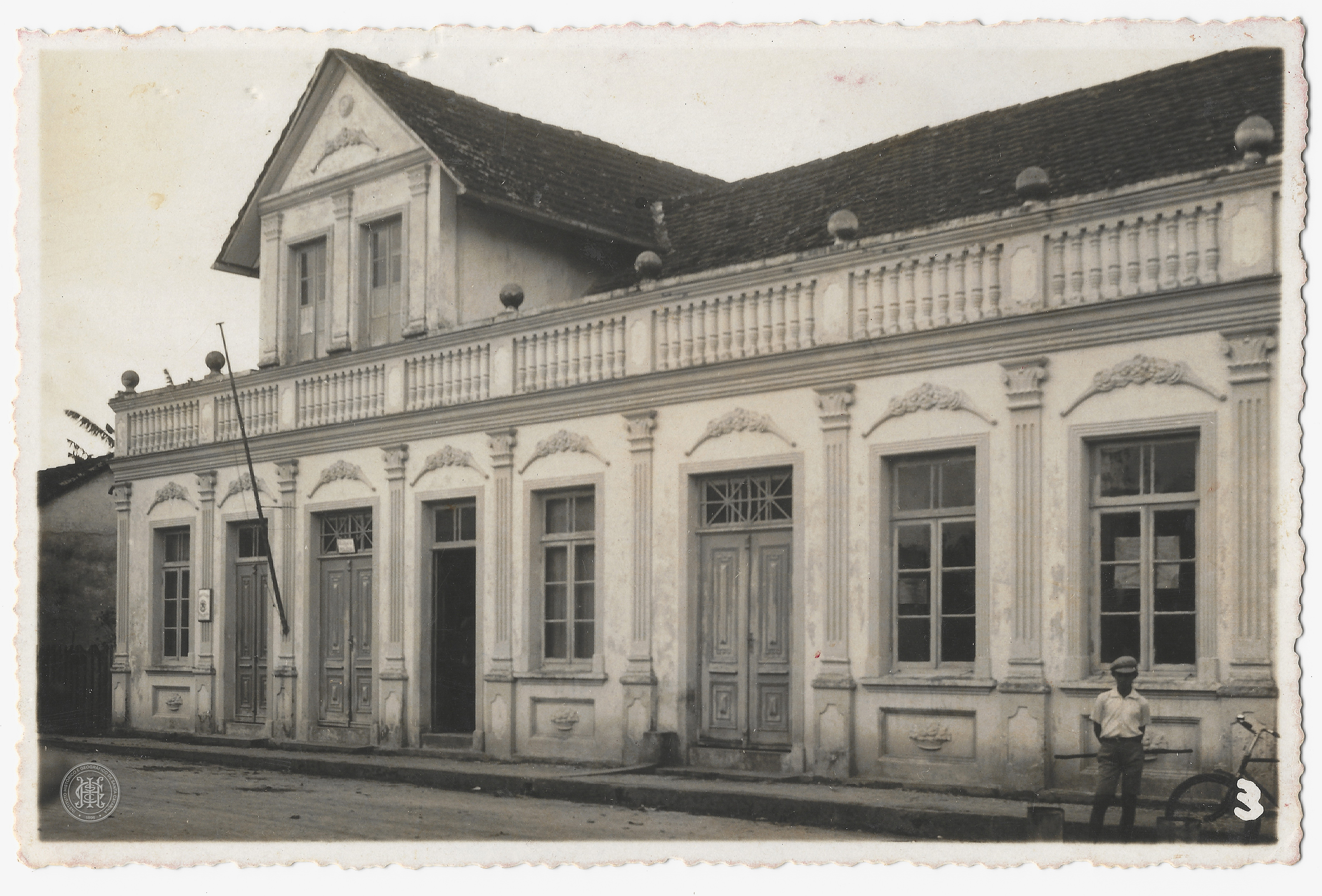 Gênero Fotográfico, Fotografia Documental, Paisagem Urbana, Arquitetura e Obras, Patrimônio Privado e Residencial, Casarios Coloniais, Edificações Históricas, Araquari, Santa Catarina, Século XX, Vestuário Histórico, Grupos Sociais e Anônimos, Meios de Transporte, Bicicleta, Pilastras, Balustradas, Ornamentação Arquitetônica, Fachadas, Joinville, Foto Brasil Documentação de Acervo