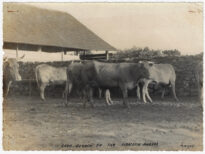 Um grupo de bovinos da raça Caracu em um cercado na propriedade de Indalécio Arruda, em Lages, Santa Catarina, entre os anos de 1938 e 1939.