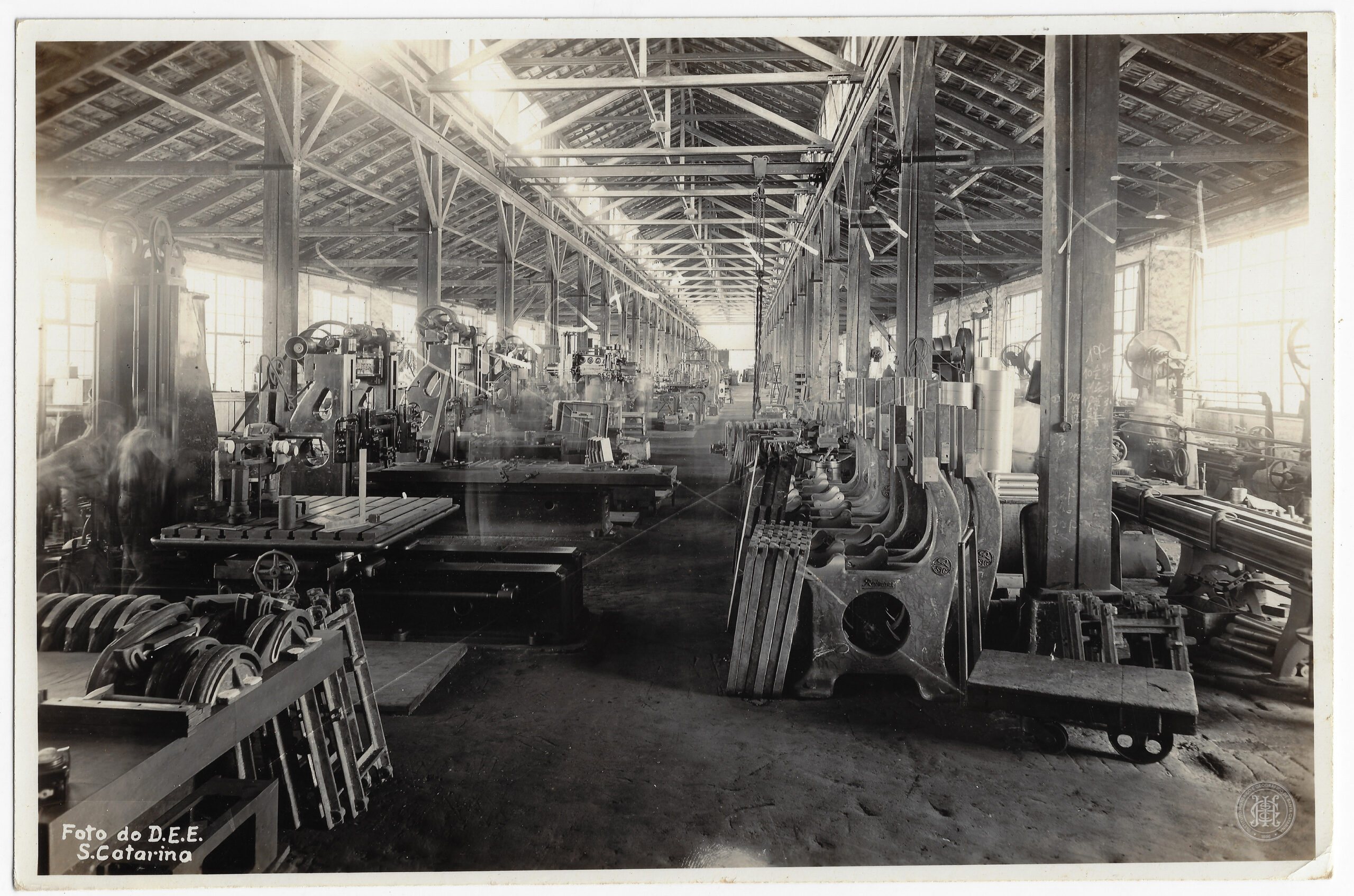A composição utiliza as linhas de fuga da estrutura do telhado e das máquinas para enfatizar a escala e a profundidade do espaço de trabalho. No canto inferior esquerdo da imagem, consta a inscrição "Foto do D.E.E. S. Catarina" integrada à emulsão fotográfica.
