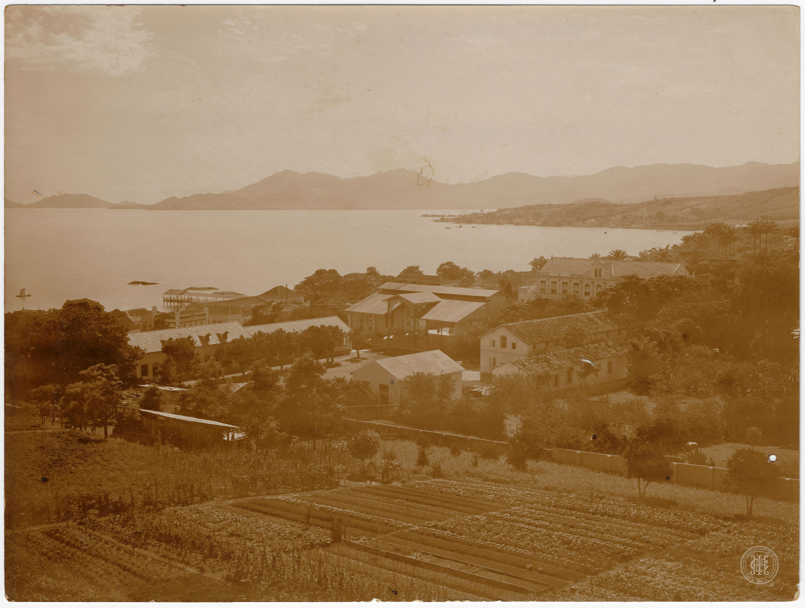 Ginásio Santa Catarina, Colégio Catarinense, Florianópolis, Santa Catarina, Vista panorâmica, Baía Norte, Paisagem urbana, Arquitetura escolar, Horta, Cultivo, Canteiros, Edificações, Século XX, Década de 1920, Mar, Litoral, Montanhas, Continente, Jesuítas