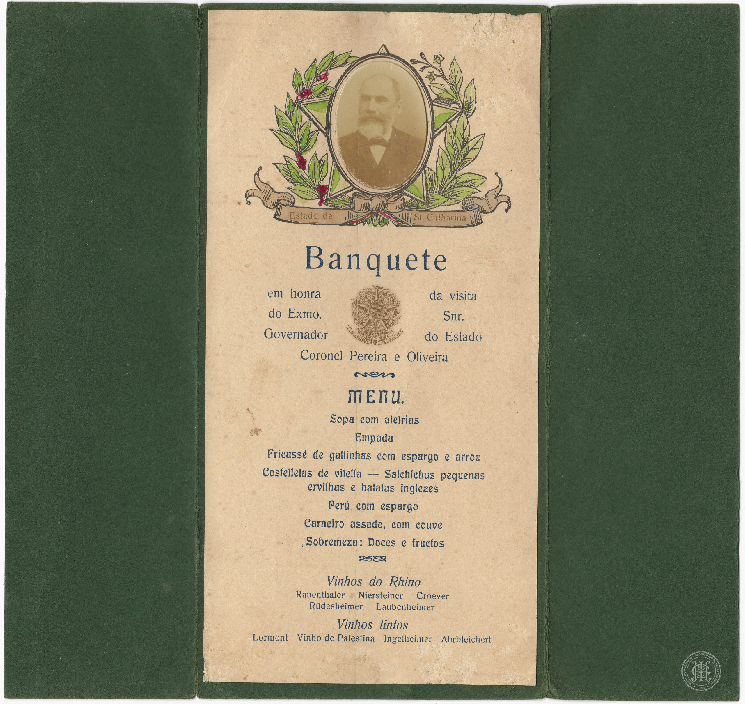 Este registro documental e iconográfico é composto por um cartão de convite e menu de banquete, estruturado em três faces, referente à visita do Governador Coronel Pereira e Oliveira a Blumenau, Santa Catarina, em 03 de junho de 1906. A primeira imagem apresenta a face interna do documento, sobre suporte de papel creme, contendo no topo um retrato oval de um homem de barba e trajes formais, inserido em uma moldura circular sobreposta a uma estrela de cinco pontas e ramos de folhagens verdes com pequenos frutos vermelhos. Abaixo do retrato, uma flâmula ostenta a inscrição "Estado de St. Catharina". O corpo do texto, impresso em azul, detalha o "Banquete em honra da visita do Exmo. Snr.