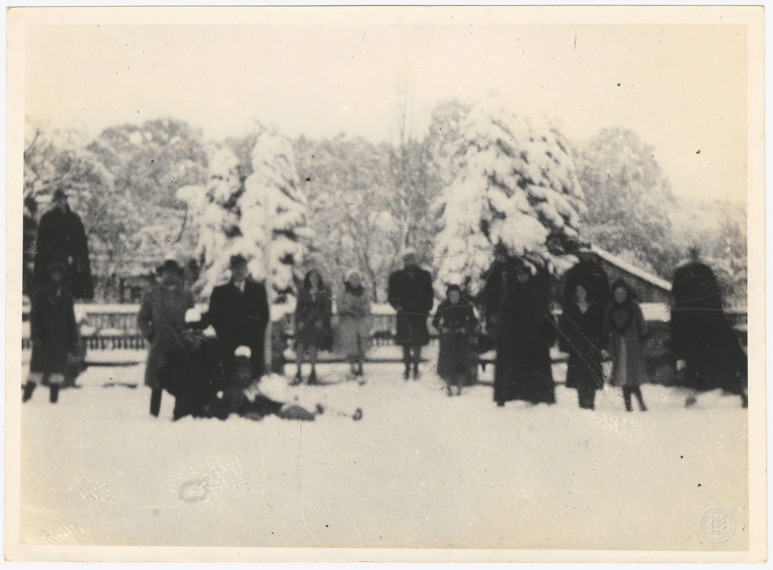 A imagem organiza-se com o grupo de sujeitos posicionados no plano médio, distribuídos de forma irregular ao longo de uma área plana e branca. As pessoas, em sua maioria adultos, vestem roupas pesadas de inverno, incluindo sobretudos escuros, chapéus e lenços. Algumas figuras parecem estar interagindo com a neve, com uma pessoa agachada ou sentada no solo ao centro-esquerda.