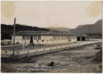 Ao fundo, à direita, visualiza-se um segundo pavilhão com colunas aparentes e uma área coberta, seguidos por uma paisagem de morros com vegetação densa sob um céu claro. Na base da fotografia, consta uma legenda manuscrita em branco integrada à imagem que identifica a localidade e a instituição.
