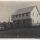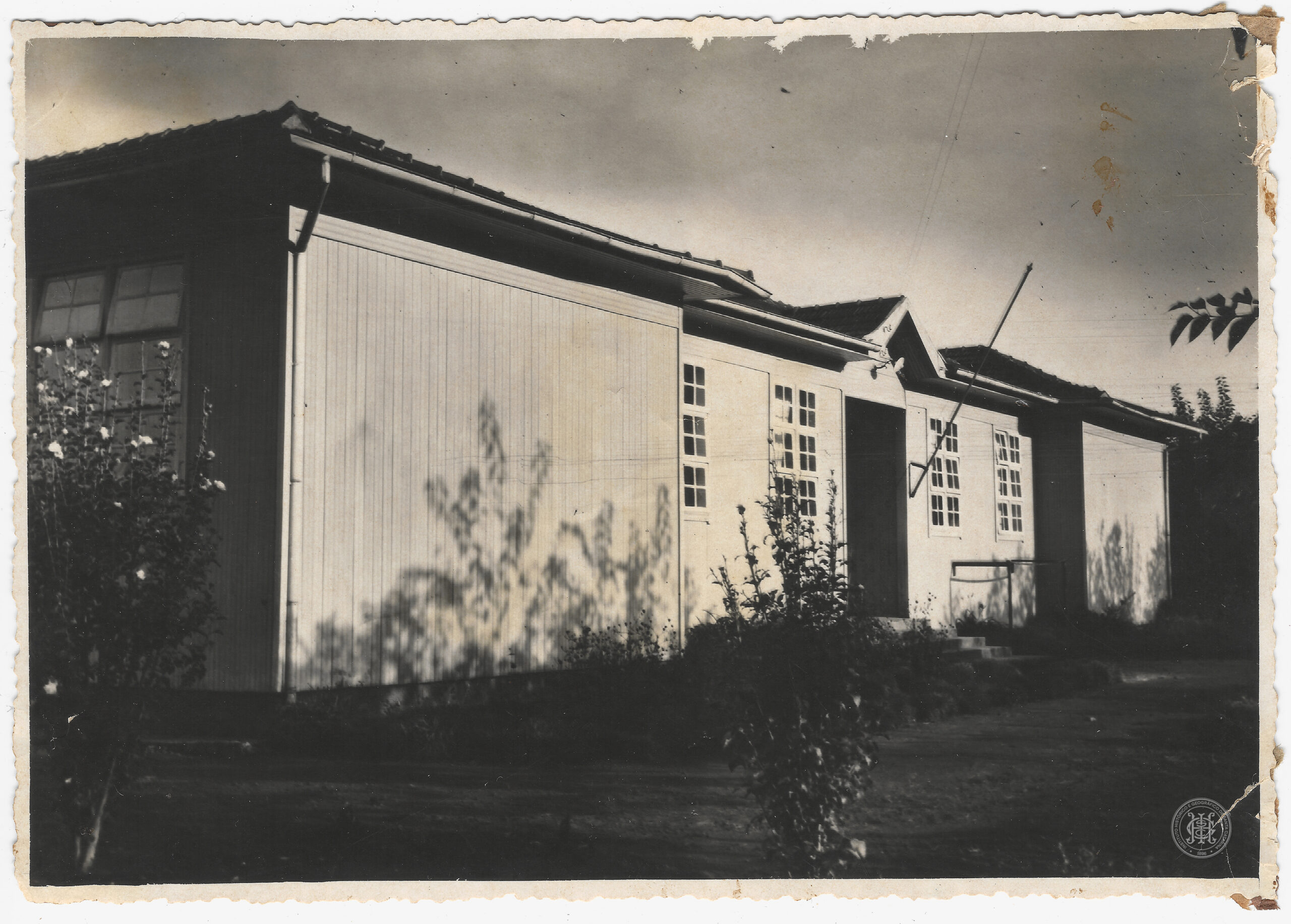 No plano médio, a fachada frontal revela uma sequência de janelas retangulares compostas por pequenas vidraças quadradas e uma porta de acesso central sob um pequeno frontão triangular. Um mastro inclinado projeta-se da fachada, acima da entrada.